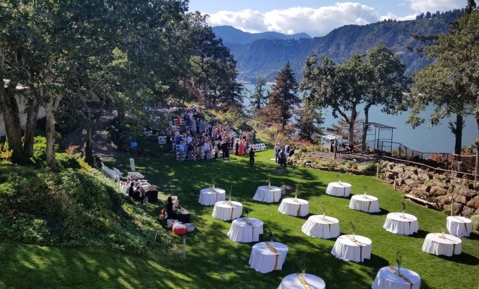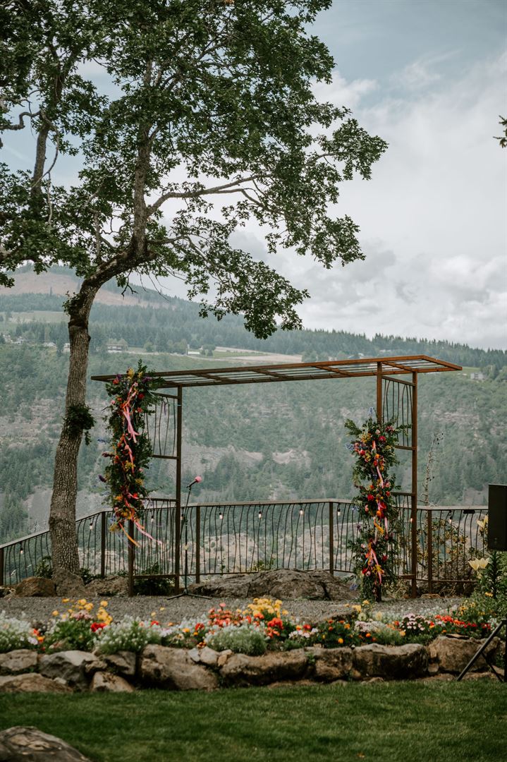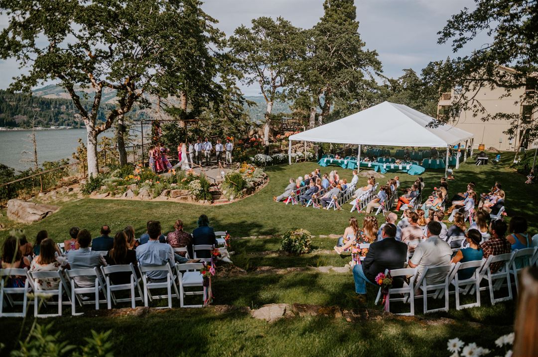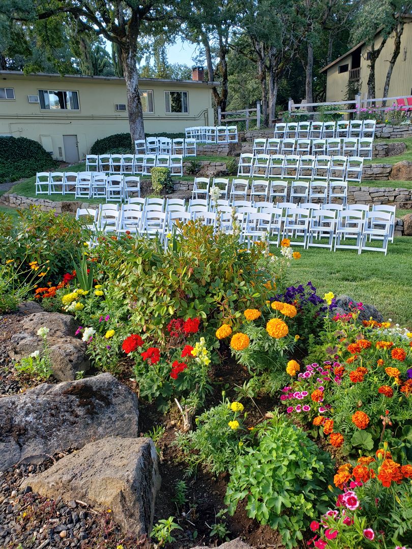 Our outdoor venue boasts stunning views on a large manicured lawn, fully landscaped with flowers, two viewpoints, and an amphitheater!