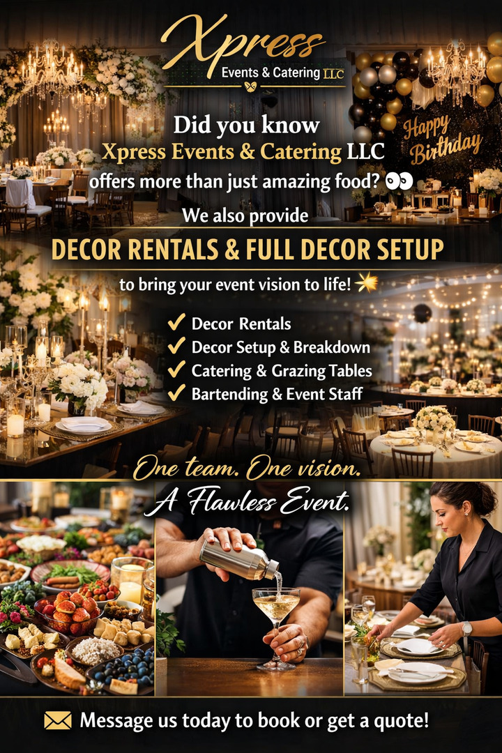 Whether you’re planning a wedding for 200 guests or a corporate luncheon for 20, Xpress Events & Catering LLC delivers flavor, style, and service that your guests will remember.