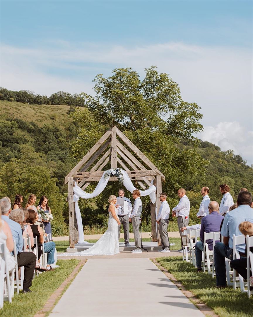 The inside venue seats 450 people with the doors closed and with the doors open, we can accommodate over 750. We have two beautiful ceremony spaces: one outdoor with the beautiful bluffs in the background and a brand-new indoor chapel with heat and air conditioning.
