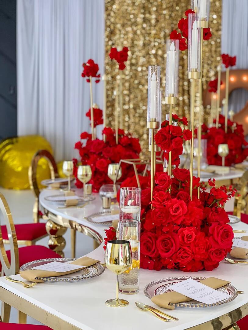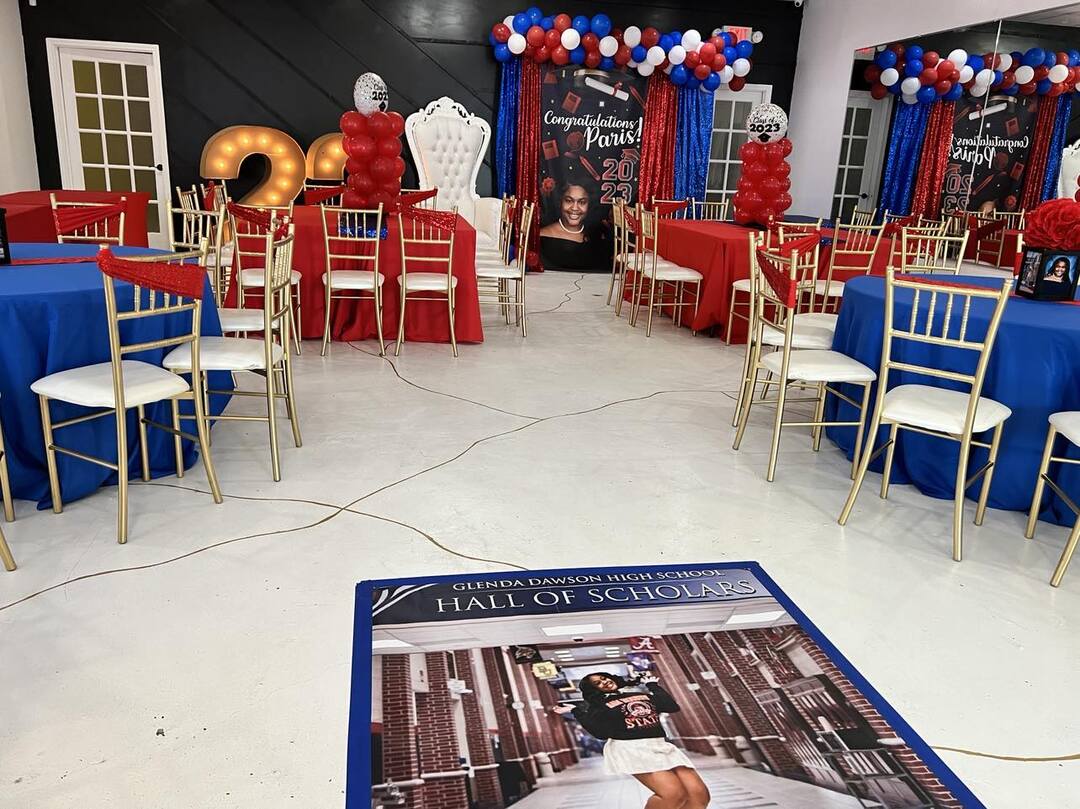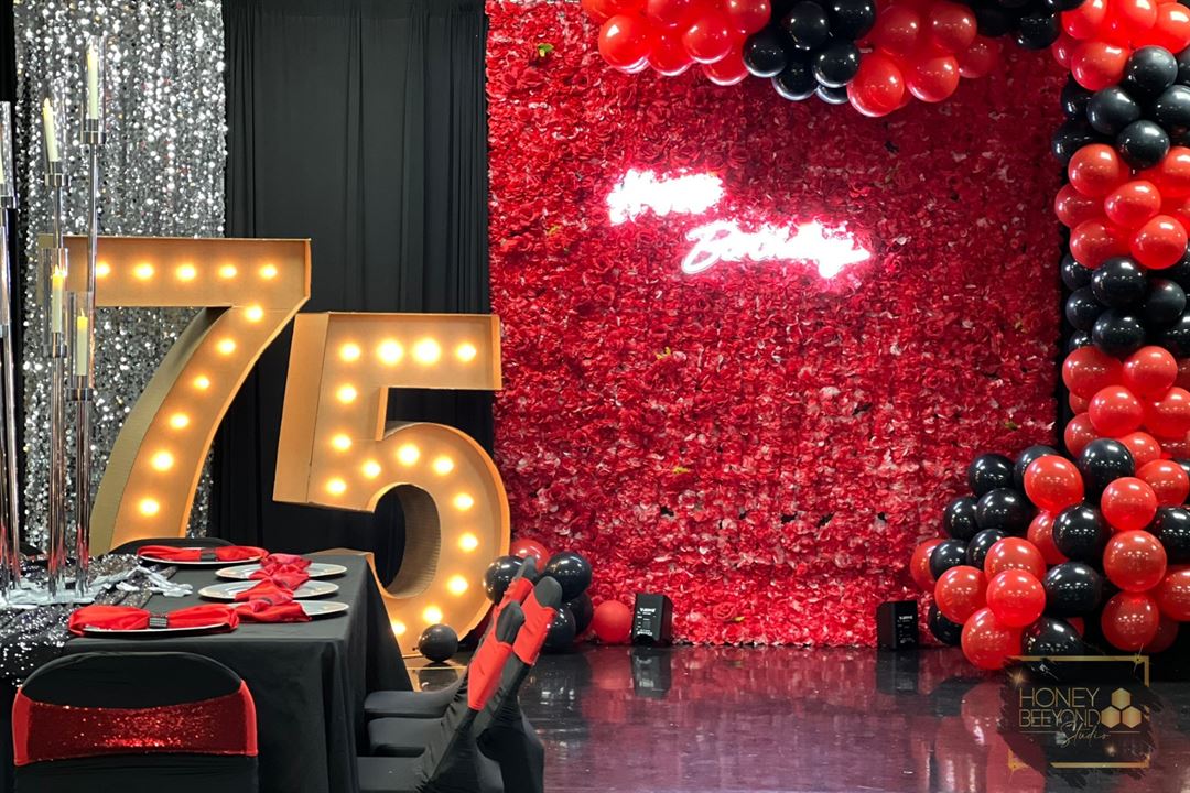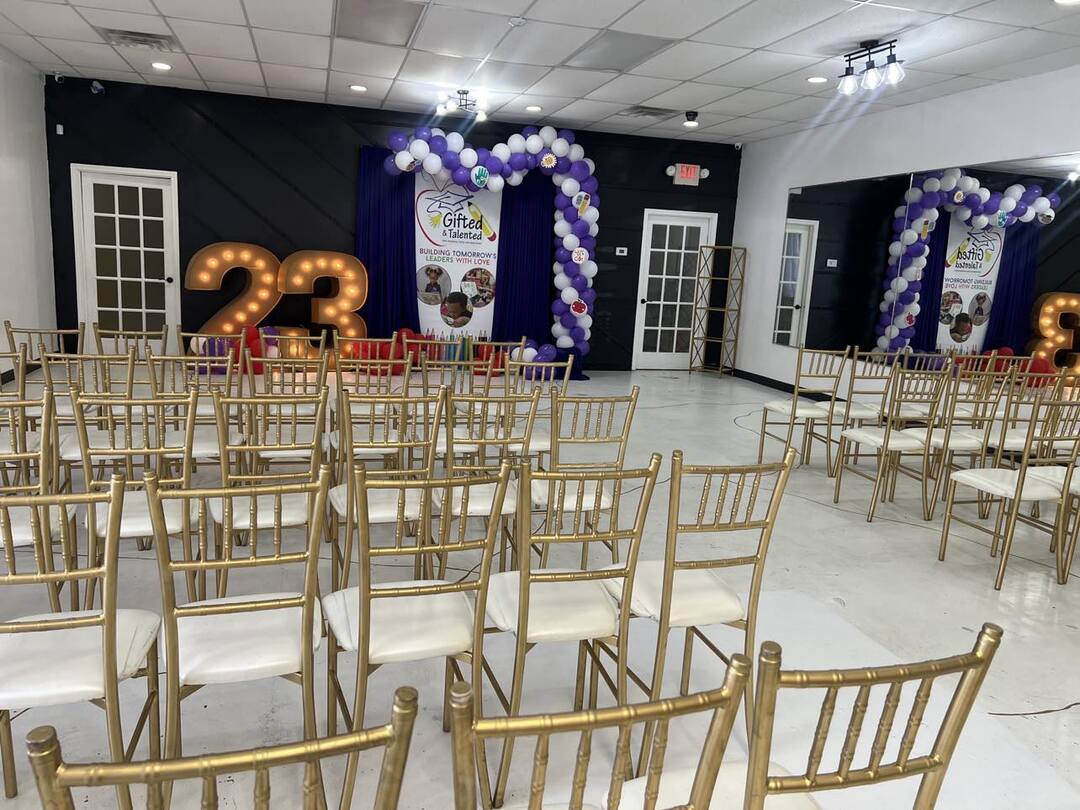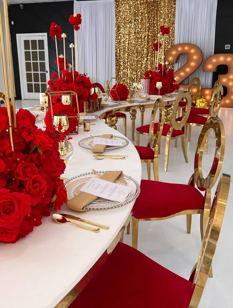 Prop rentals, balloon decor, event furniture rental, custom backdrops, custom invitations, custom centerpieces, chair covers, tablecloths, draping, uplighting & more