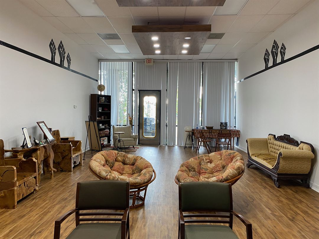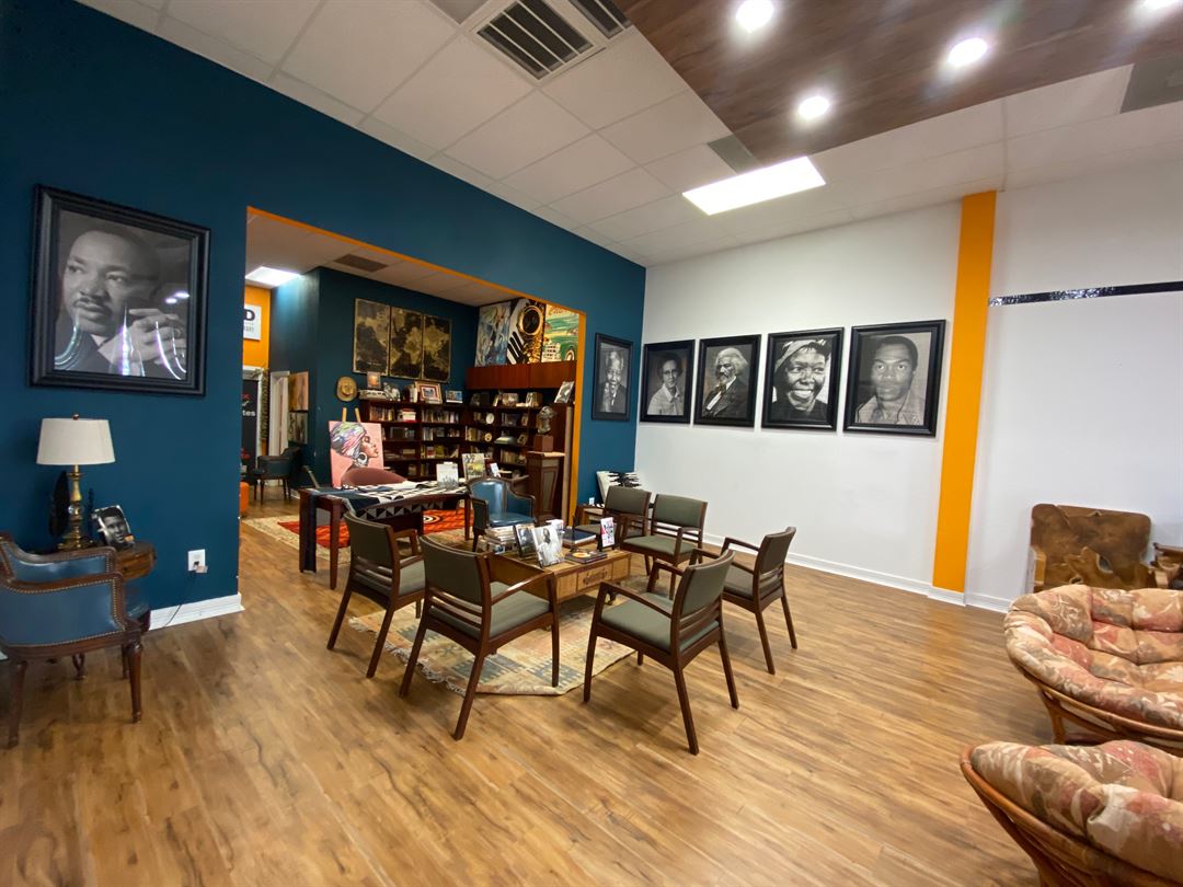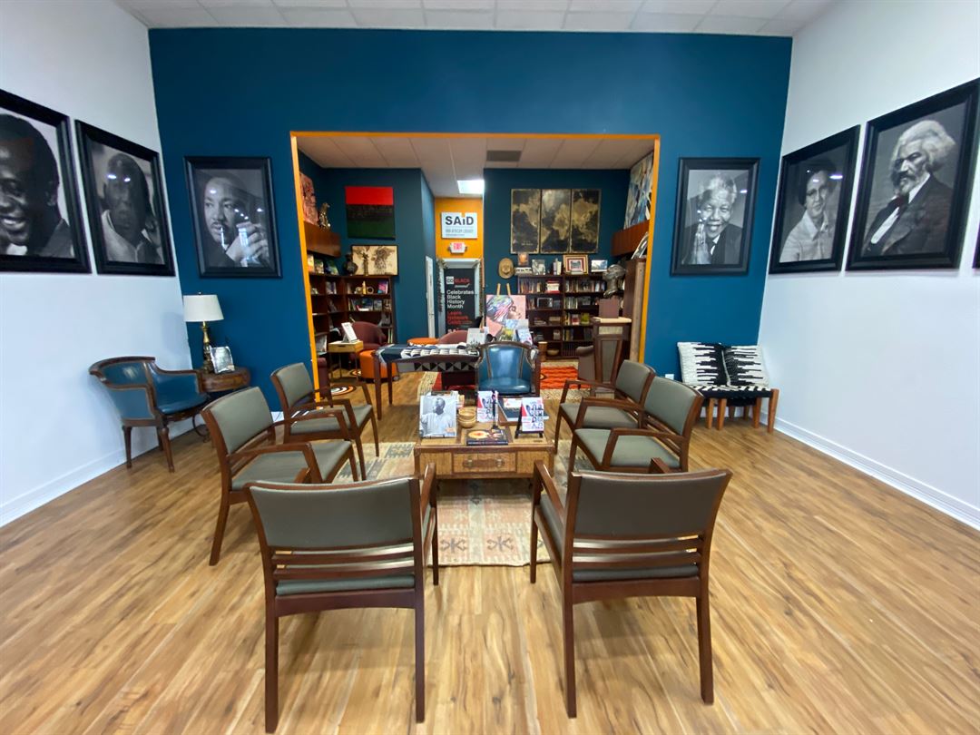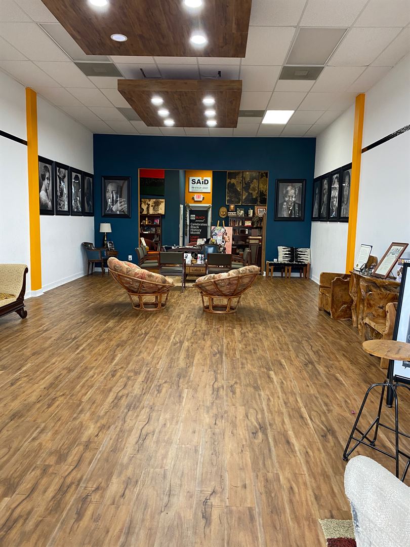 SAiD is the perfect place to host art exhibitions, poetry slams, book releases, book club meetings, symposia, and so much more! We love to showcase the art, history, and cultural richness of the African Diaspora. This space was designed for versatility, with chic elements and a Pan-African flare. If needed, decor may be rearranged to create an ideal space for workshops, classes, pop up shops, or product launches as well. The space is both cozy and modern. There's a large, open central area with a beautiful front mesquite floored room facing the street. Towards the back, we have art pieces and books that comprise our treasured library of over 700 books.