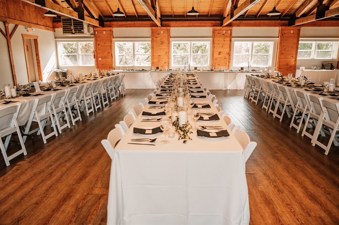 The Glacier Hills Hall features a 4,000-square-foot room that can accommodate up to 200 people. The space directly outside is the perfect spot for an outdoor ceremony, cocktail hour, or reception. Glacier Hills offers both indoor and outdoor ceremony locations for couples looking to get married surrounded by nature. The Little Flower Mission Chapel is located steps away from The Glacier Hills Hall, seats 160 and offers an intimate and historic atmosphere for your wedding ceremony. We also offer 9 cozy cabins and a charming guest house available within the property if you'd like to make your wedding a weekend event!