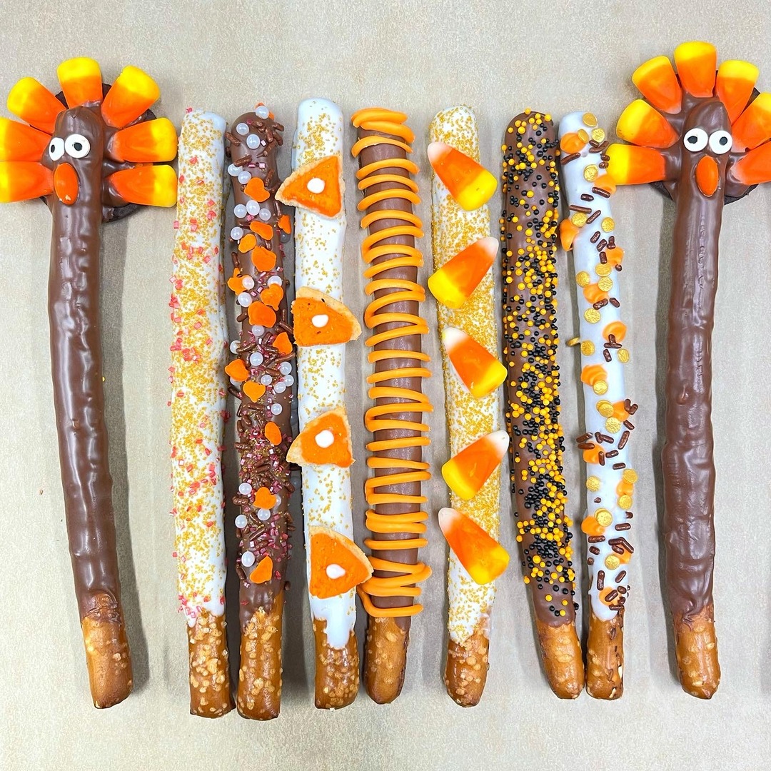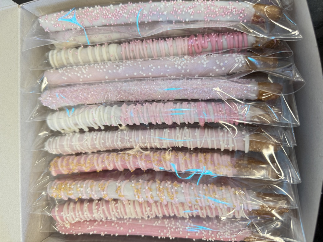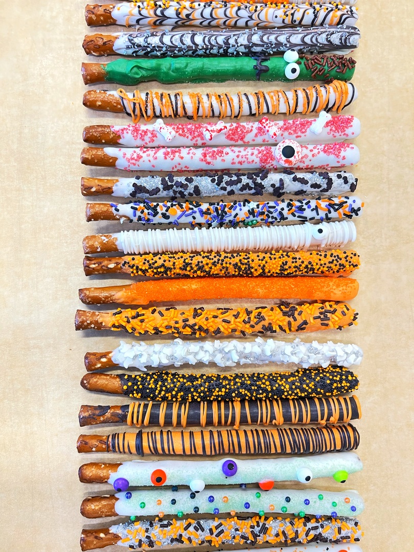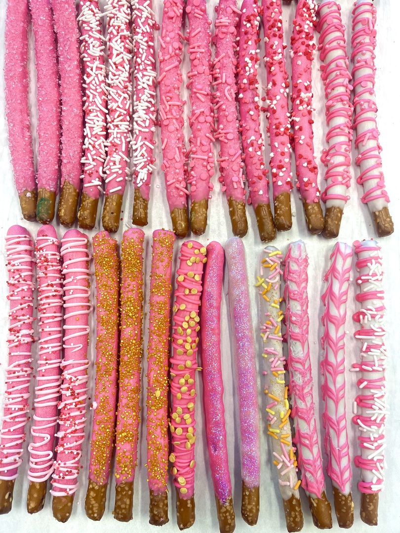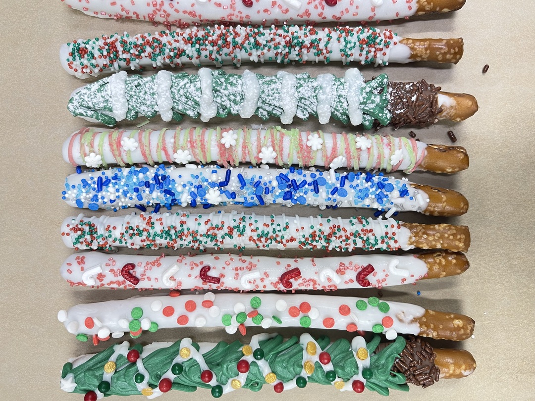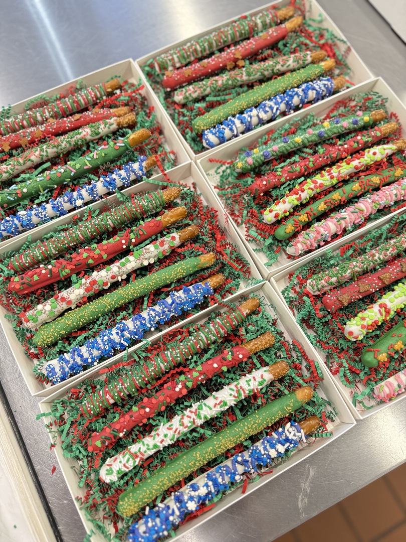 Handcrafted pretzels dipped in premium chocolate and decorated to match your event. Great for corporate gifts, holiday spreads, or dessert tables.