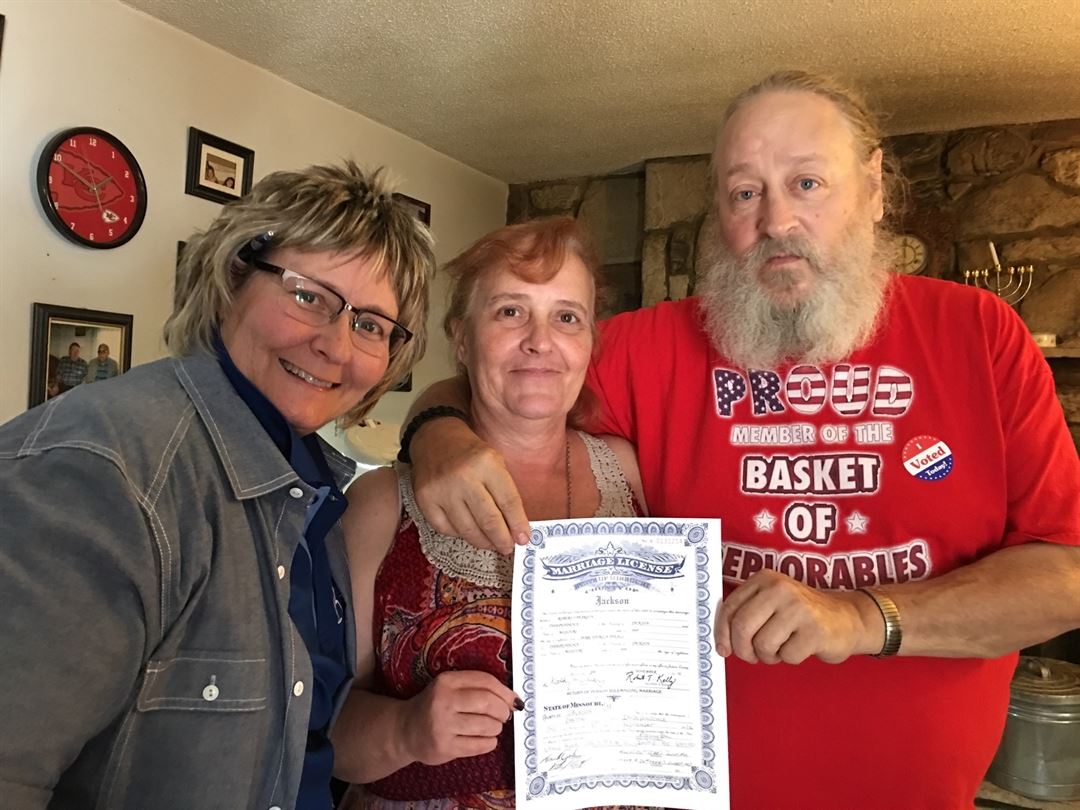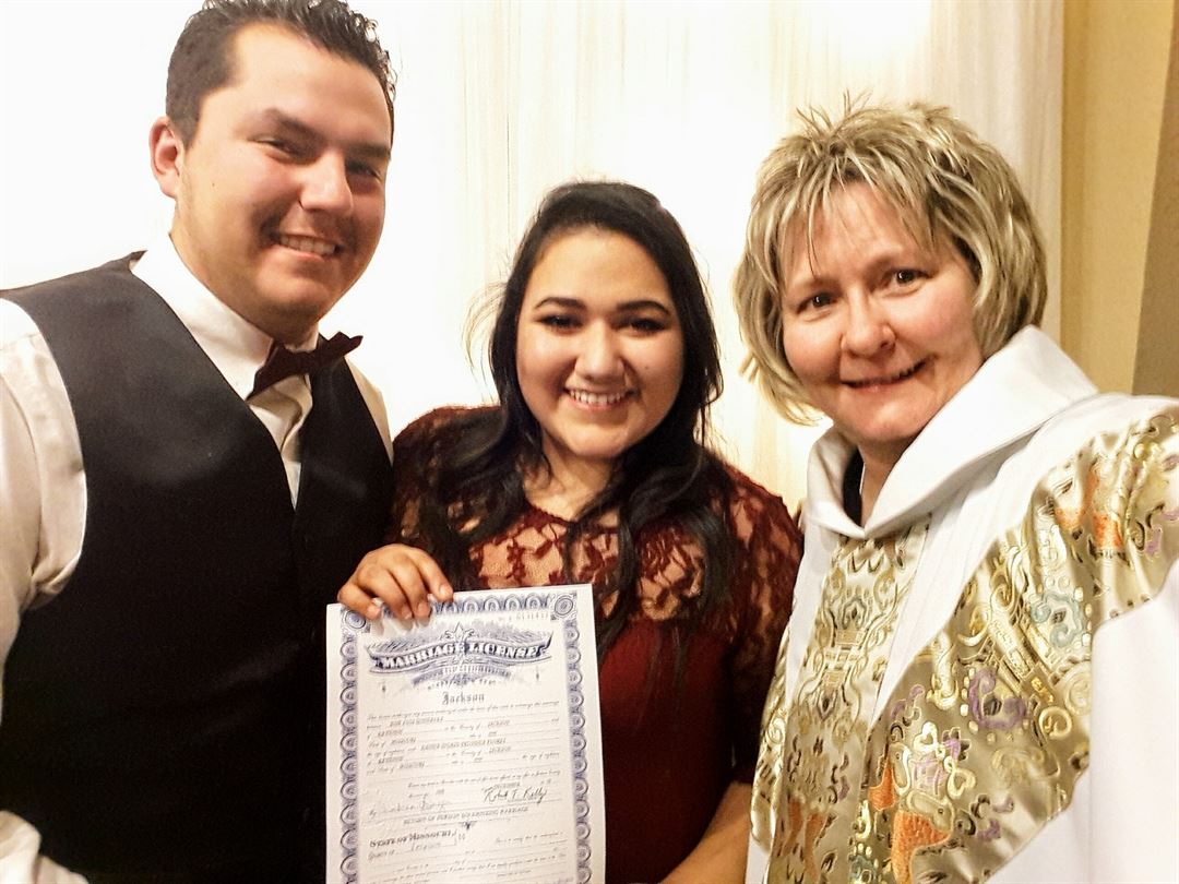 Thank you for stopping by. We here at KC Weddings 2 Go are completely dedicated to taking care of your Officiant needs in Missouri or Kansas. Nancy Kerr, our owner has been in the Wedding industry for more than 35 years and truly understands your officiating needs. You can have your ceremony at one of our Quaint Little Chapels, located next to the Historic Truman Courthouse in Independence, Mo or Overland Park, Kansas. In Jackson county you can pick up your marriage license no matter where you live and it takes only 15 minutes, there is no 3 day waiting period like in Kansas. After you pick up your marriage license just walk over to the chapel for your Ceremony or a quick simple signing of the marriage license. Our other beautiful stained glass Chapel is located in downtown Overland Park, Kansas and will seat up to 30 guests. We can also come to any location of your choosing and Pastor Nancy can do your ceremony in Espanol as well! Fully licensed, insured and ordained we do all types of ceremonies. In your backyard, favorite park or on a boat in the middle of the lake we are happy to come to any location. We are the original "full-time wedding officiants" in Johnson, Jackson, Platte, Cass, Wyandotte, Leavenworth, Platte and Clay counties serving you 24 hours a day 365 days a year. Fees will be based on day of the week, time and location. A Legal Signing of your marriage license would start at $125 in Missouri and $150 in Kansas depending on the day of week and time of day at our Chapel. A simple ceremony with you providing the two witnesses would start at $175.00. If you do not have witnesses we can always provide them for you at a cost of $25.00. Our combination packages called the intimate package would include officiating and professional photography with use of our bouquet and boutonnieres. Those packages start at $499.00 on a weekday. We give a discount for active duty military. We look forward to hearing more about your special day! So call us today!