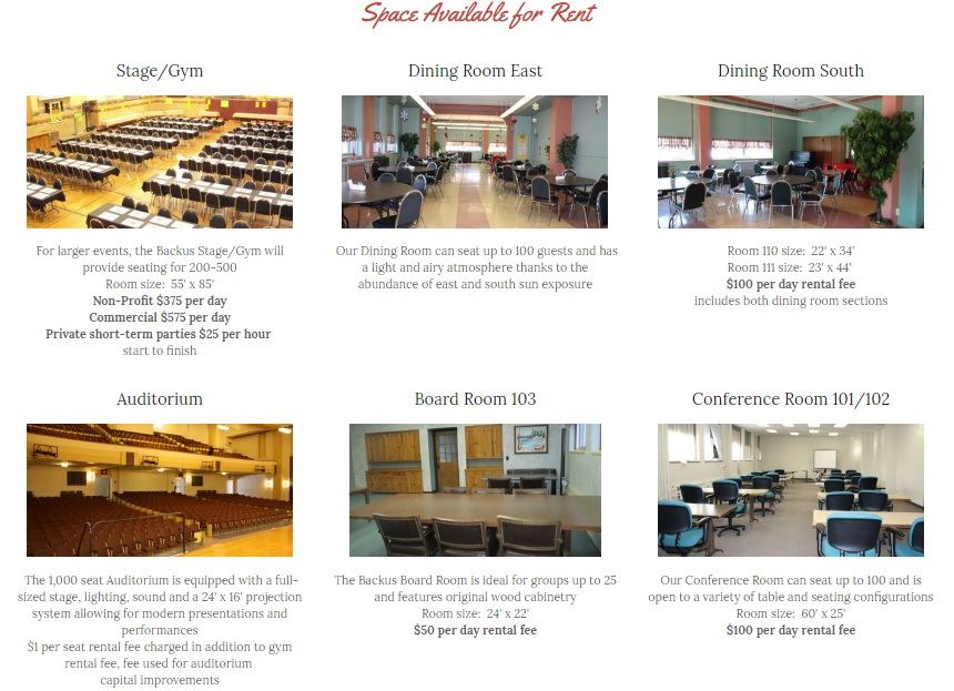 Backus Community Center is host to a wide variety of events. Our building was originally built as a school in 1936. With thanks to a group of dedicated locals, it has been preserved and turned into the heart of our community. With an auditorium, a number of varied sized spaces and a wide selection of equipment, we are able to support just about any wants or needs.