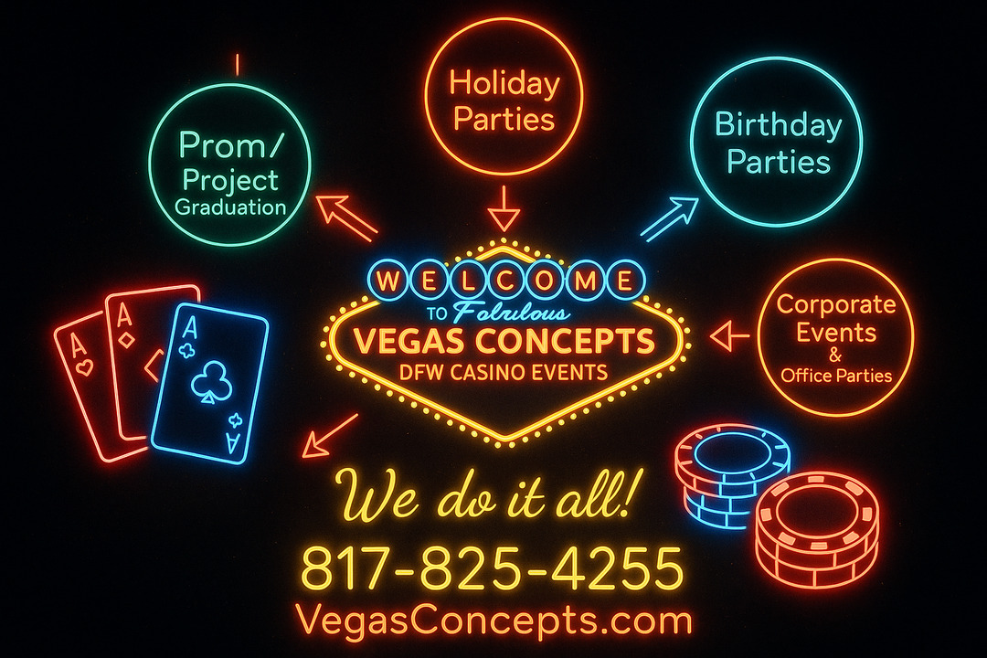 Bring Vegas to your next event with Dallas Fort Worth Casino Parties Rental – your one-stop source for unforgettable entertainment! We specialize in delivering high-quality casino-themed parties and a full suite of event services designed to wow your guests and create lasting memories.