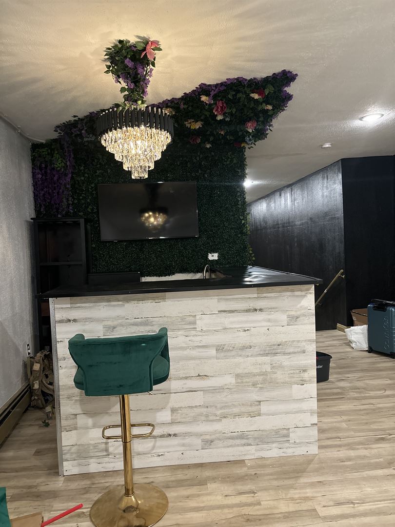 The open-concept layout is designed to be easily customizable for various setups. As you enter, you are greeted by an elegant lounge area, ideal for casual mingling or as a waiting space for guests. The main event room features high ceilings adorned with a stunning chandelier, and the walls are covered in soft, neutral tones to create a warm and inviting ambiance. The space is enhanced by lush greenery and elegant wisteria accents, adding a touch of natural beauty to the luxurious décor.