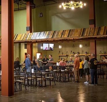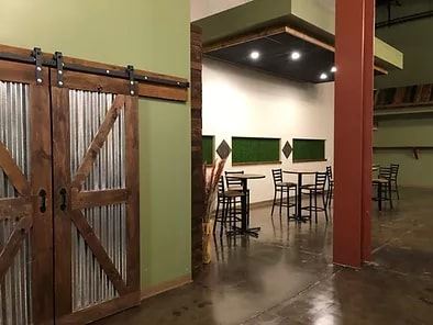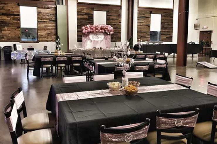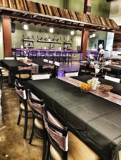 Our venue has seating for up to 100 guests, mixing of high top and low top butcher block with additional round-clothed tables. We have a platform stage for your band, DJ, or wedding party seating, a spacious dance floor, three large projection screens, and a sound system.