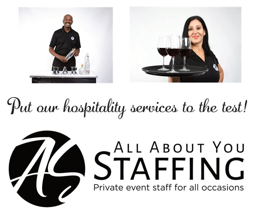 All About You Staffing provides private event staff for all occasions. Unlike temporary staffing agencies, our staff are permanent part-time workers with our company and they are always covered under our event liability insurance policy. All staff members are hospitality trained in a classroom and receive on the job instruction from our shift supervisors throughout your entire event. Our clients enjoy our shift supervisor as the point of contact to manage the entire staff, this provides limited interaction for the host who can enjoy their event.