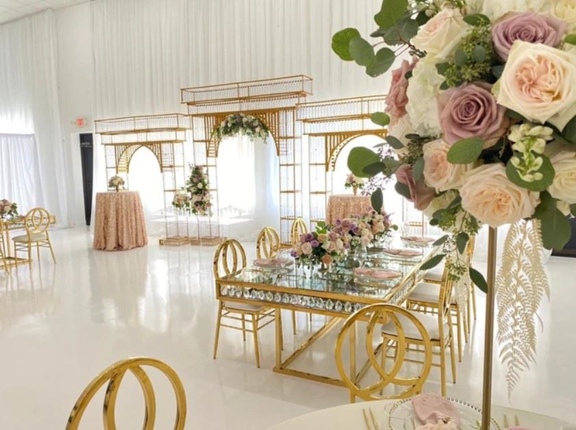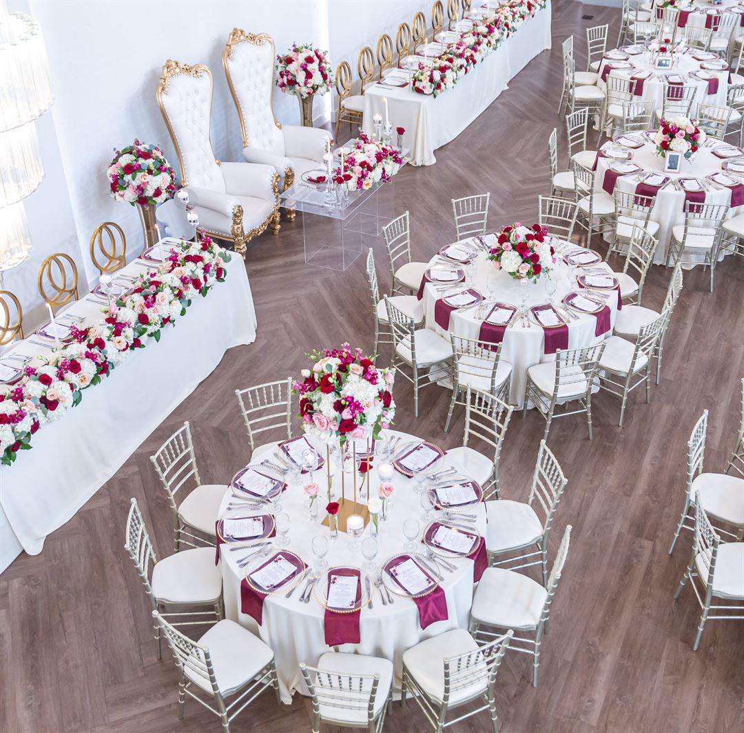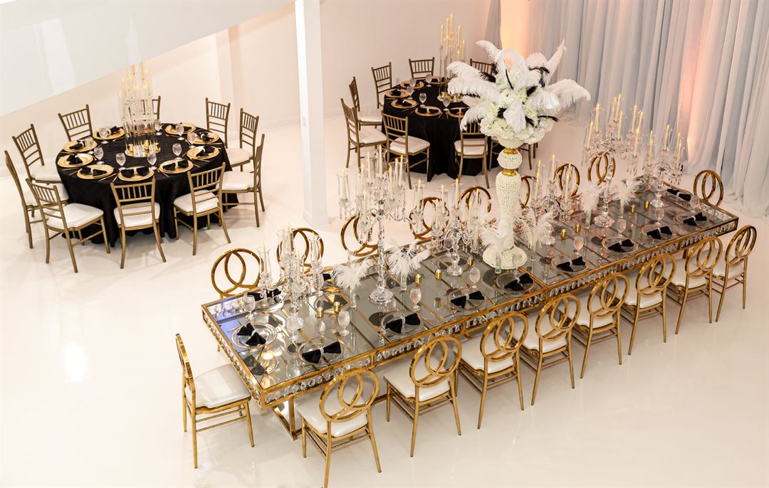Discover Cosmopolitan Ballroom, the premier event and wedding venue in Jacksonville. Our affordable packages and wedding planning team make us the perfect choice for your special day. The exquisite charm of our pristine white room, complemented by a distinctive layout featuring an elegant staircase, enchanting balcony, inviting lounge area, and towering ceiling, sets the ideal ambiance for your celebration. In addition to our exquisite space, we offer an extensive collection of meticulously curated tablecloths, centerpieces, backdrops, charger plates, and all the trimmings necessary to bring your wedding or special event to life. With luxurious décor and a spacious dance floor, we're also the ideal party venue. Contact us to schedule a tour!