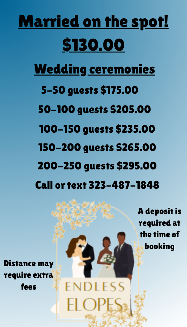 Brianna ministered our wedding. She was polite, on-time, and professional. She even gave us a discount for being active-duty military which made it even better! She also captured the weeding ceremony on video and made a short-clip movie free of charge. I highly recommend Endless Elopes and Brianna if you need someone to marry you and your special person!