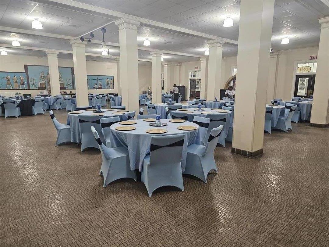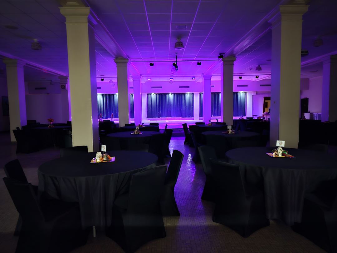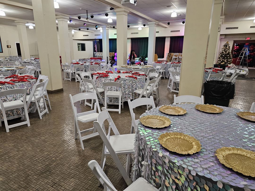 Parties, Events, Weddings, Musicals, Theater, and Business meetings. we have a 700 seat Theater, 288 person Dining Hall. Tables, Chairas (covers) two big screens computer interfaced for all presentations. Full Bar and food services. DJ Lighting systems and audio with wireless microphones. sound activated light show. Plenty of parking.