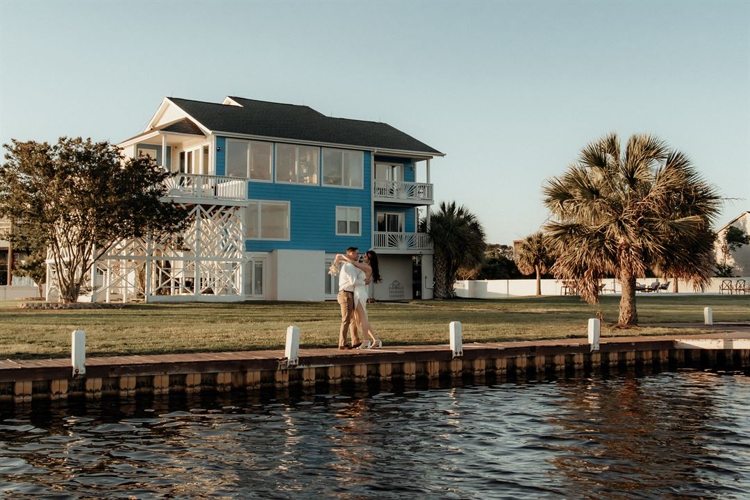 Located in downtown Jacksonville, NC on the beautiful New River, this three-story house is on one acre of meticulously landscaped yard with scenic views of Wilson Bay. The home can sleep up to 18 people and can also accommodate 200 guests for a sit-down dinner on the lawn as well as plenty of room for a large tent in case of inclement weather. This property not only includes the beautiful 3-story home for the Bride and Bridal party, but it also includes Groom's Quarters located next to the main property that sleeps up to 8 people. This property has future developments underway that include a 40-foot yacht that sleeps 8 people and a private island in close proximity for events to be held on. Once you've booked your wedding or event with our venue, upon arrival you will be greeted with complimentary amenities as a thank-you for choosing us to host your special occasion. All of this is included in one flat rate for 4 days!