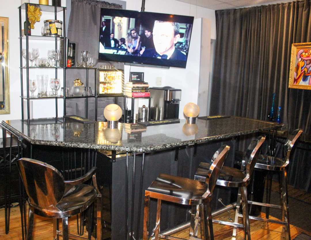 This unique lounge features three distinctive areas of entertainment; a main gallery that offers a bar w/ seating, a suspended 60” TV offering viewing from all angles, dining tables & chairs, comfortable club chairs and tables suitable for dining playing chess, cards etc.. and a center standing socializing table. The other two entertainment areas are the screening room with an 70” TV oversized barstools and hightop granite tables, banquette seating w/ 5 individual dining tables. This room can easily be transitioned to suit your specific event needs. The 3rd entertainment area is the conversation room with plush leather sofa and loveseat coffee tables, extra large comfortable chairs and a 50” TV.