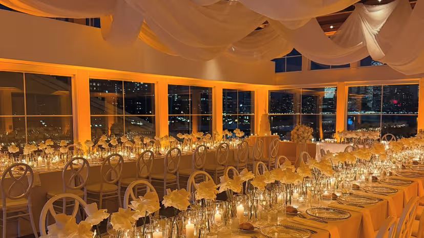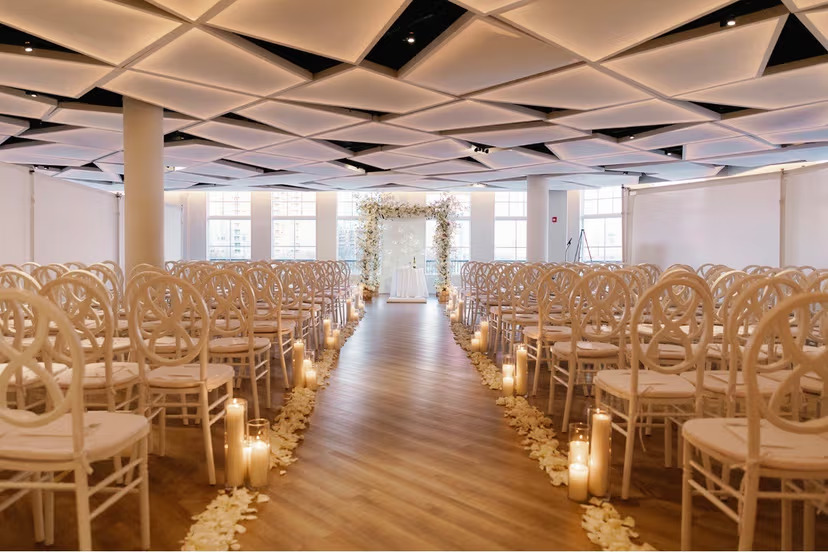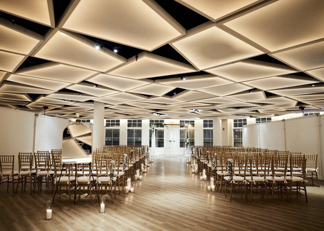 Boasting 18,000 square feet of space, Maritime Parc comfortably accommodates up to 300 guests seated with a dance floor and up to 700 guests standing. The private event space consists of two different rooms both featuring wraparound outdoor terraces, hardwood floors, and pin-spot lighting. The third-floor Aviary Room has a 22-foot vaulted exposed beam ceiling. The second-floor Sky Room, meanwhile, is a uniquely designed space featuring a modern play on clouds with ceiling panel illumination. There are bridal suites available for the couple to use throughout their event.