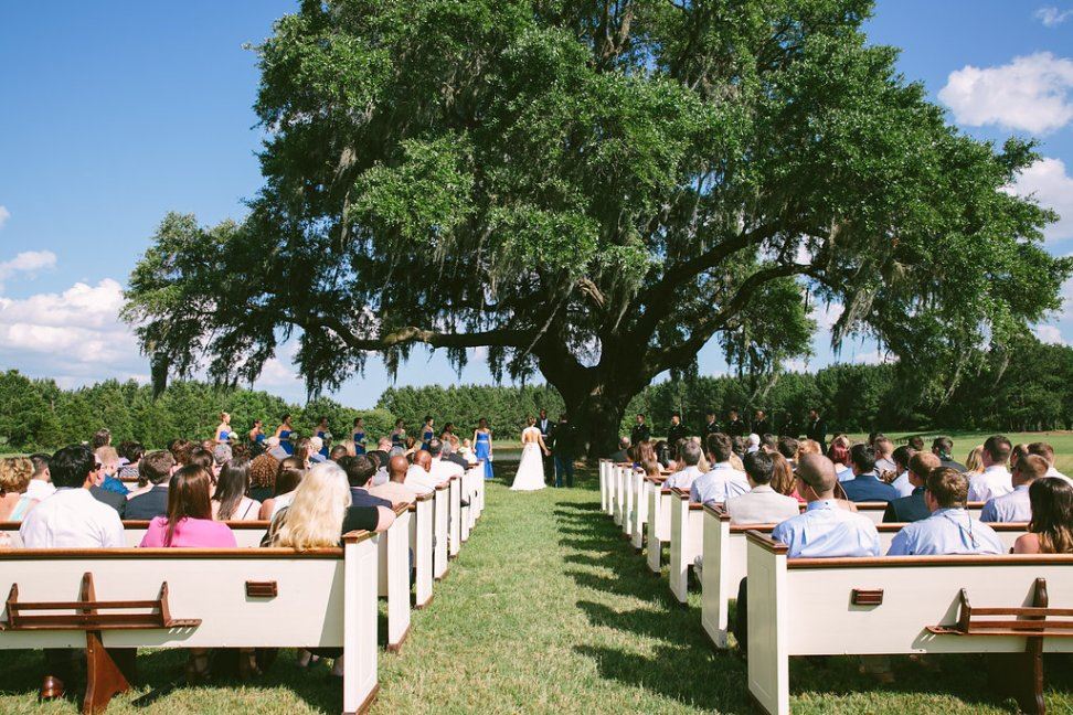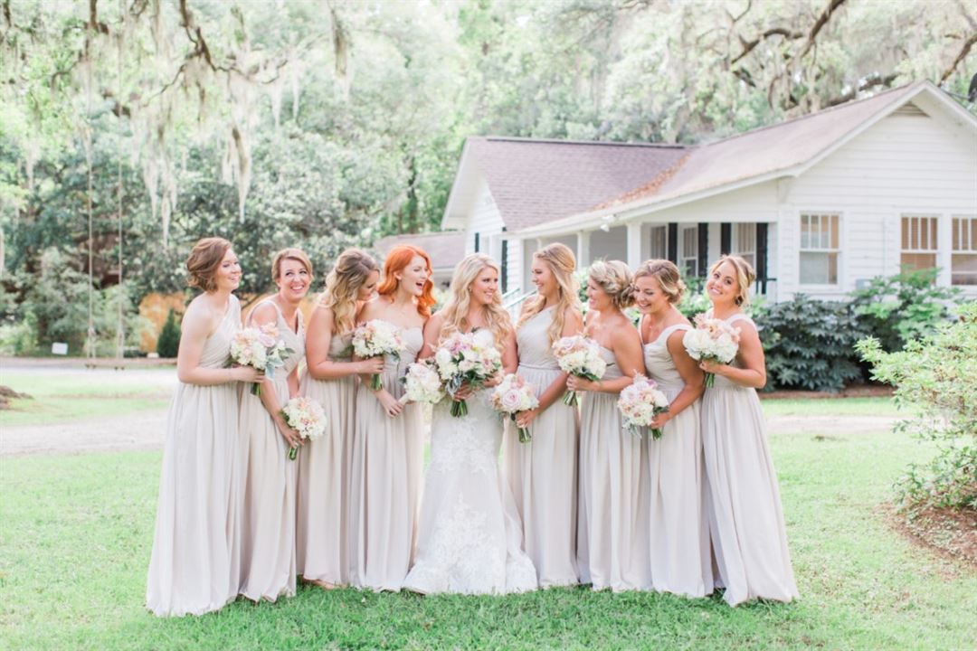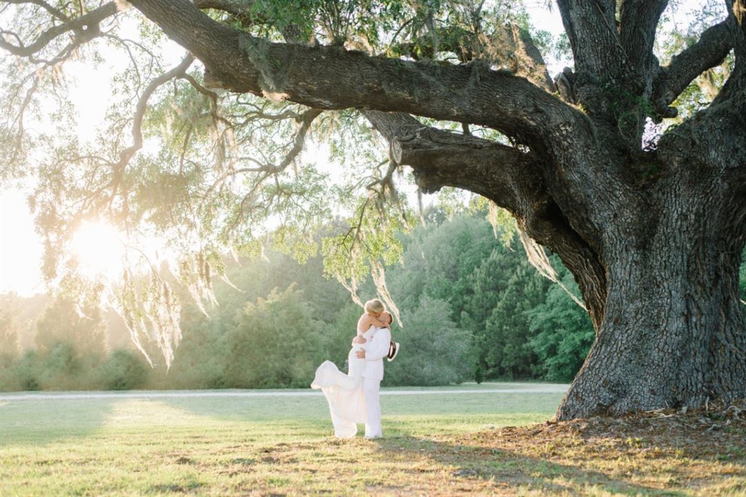 Our Charleston wedding venue features a quaint, old farmhouse nestled among centuries old, majestic oak trees draped in Spanish moss. The site has a 40×80 elegant wedding tent situated on the banks of a placid, saltwater pond.
