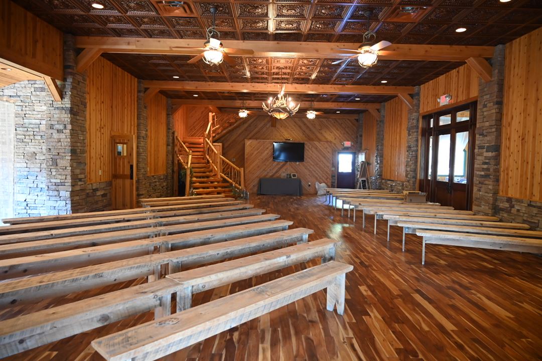 The main floor of the Chalet offers a, corner stone gas fireplace, 60” smart tv, 2 restrooms & a full commercial kitchen. Two large wooden French doors lead out to the enclosed patio, which host huge barn doors that open creating a pavilion type setting.