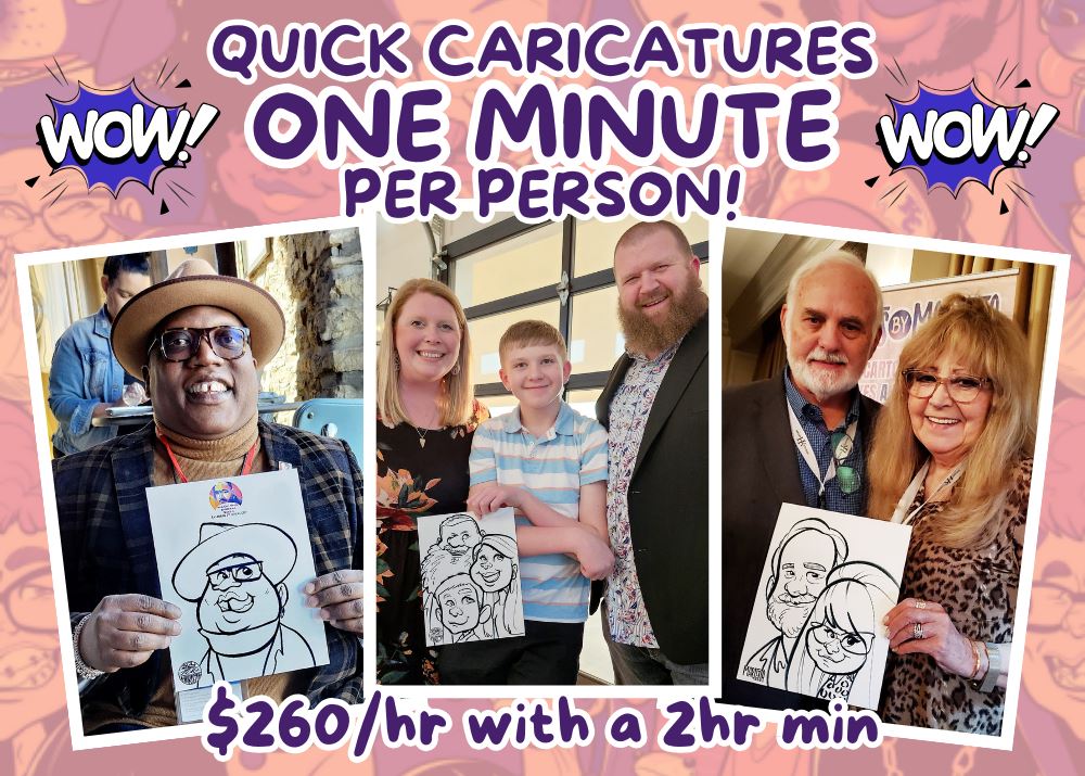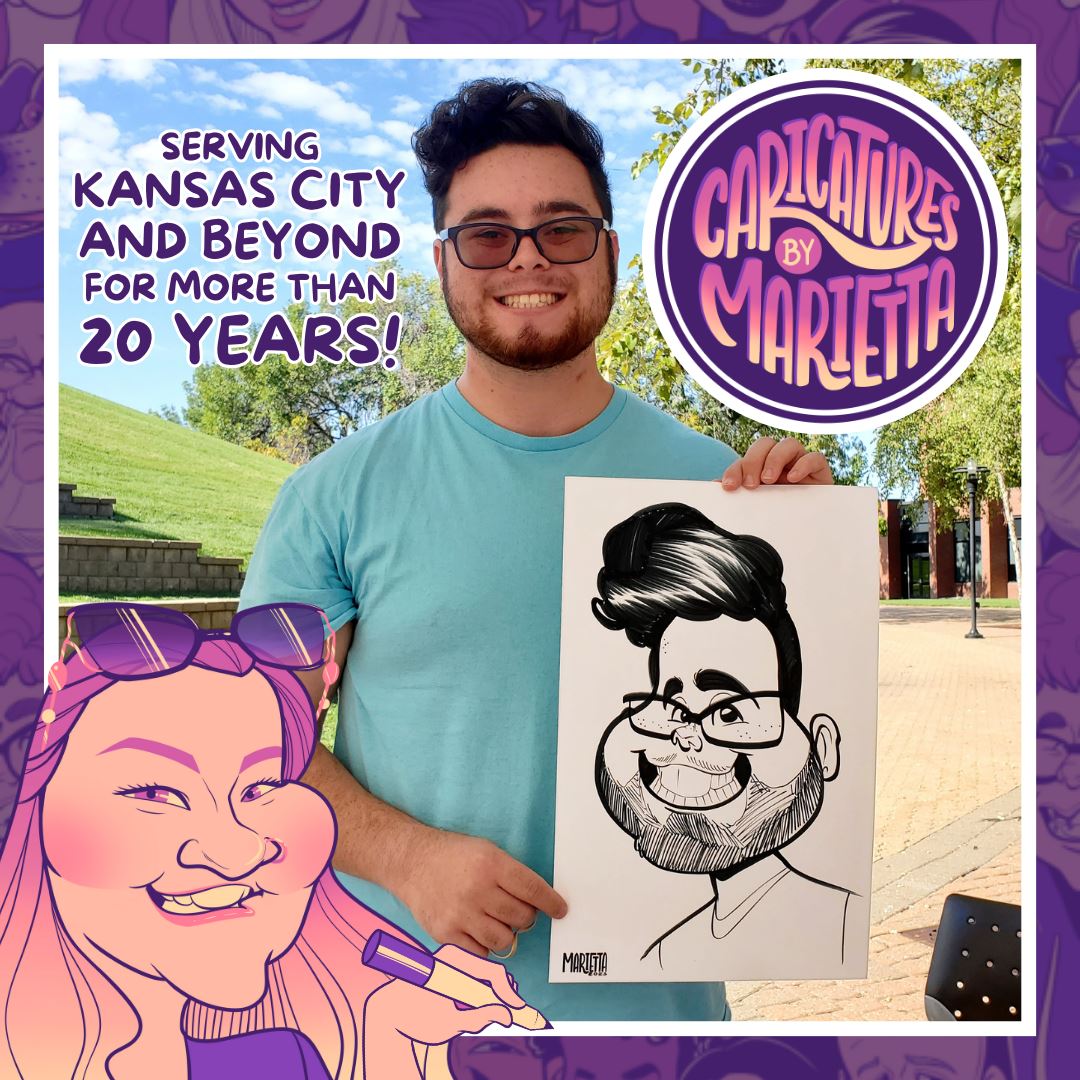 Marietta is one of Kansas City's go-to caricature artists, with clients ranging from Google to Walmart, IKEA to Nascar, and even the KC Chiefs, Royals, and Current! A full-time caricature artist for over 20 years, Marietta knows exactly what she's doing when she puts the marker to paper. Just a few minutes is all it takes to give your guests a beautiful memory of your event - one they'll love hanging on their wall for years to come! Marietta's gentle, easy-going personality means guests of all ages will be at ease with her - and her caricatures speak for themselves. With Marietta, your celebration is sure to be the event of the year! Let us know what Marietta can do for you!