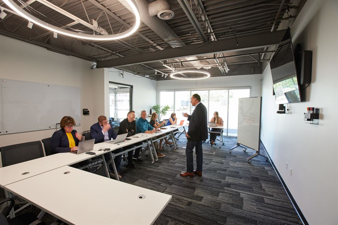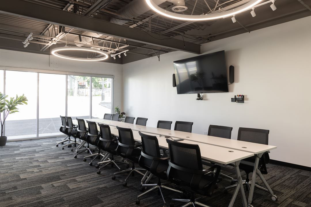 Technology and Meeting Tools: The boardroom boasts a 85" 4K Samsung TV that connects effortlessly to devices via wired or wireless connection, 16' of mounted white (glass) boards, a mobile glass board, Logitech Rally 4K conference system and speaker, and 1GB Google Fiber Wifi.