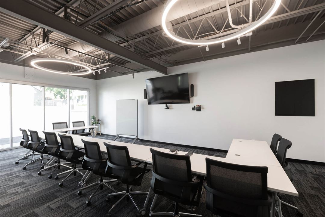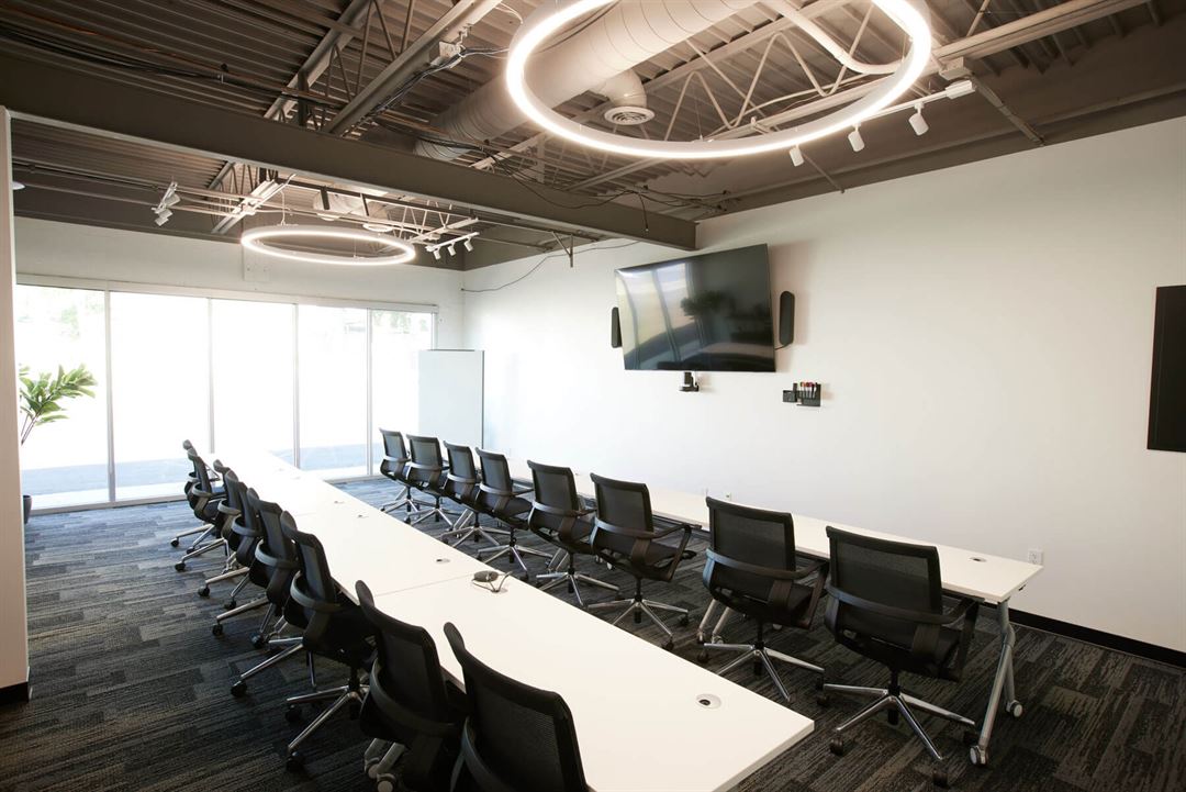 Layout: The boardroom - a private space that seats up to 16 people. The modular tables can be formed into a large U, boardroom set up, classroom style or pods depending on the needs of your meeting. The space also contains a private large open space with couches, chairs, and table seating where great relaxed collaborative conversations can happen. In addition, there are three private bathrooms and a phone room so no need to rush to the car to take a call. The space also has access to a full kitchen and private to the building patio space.