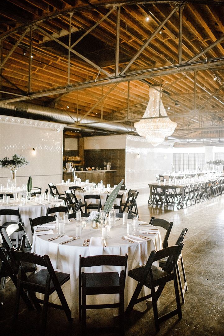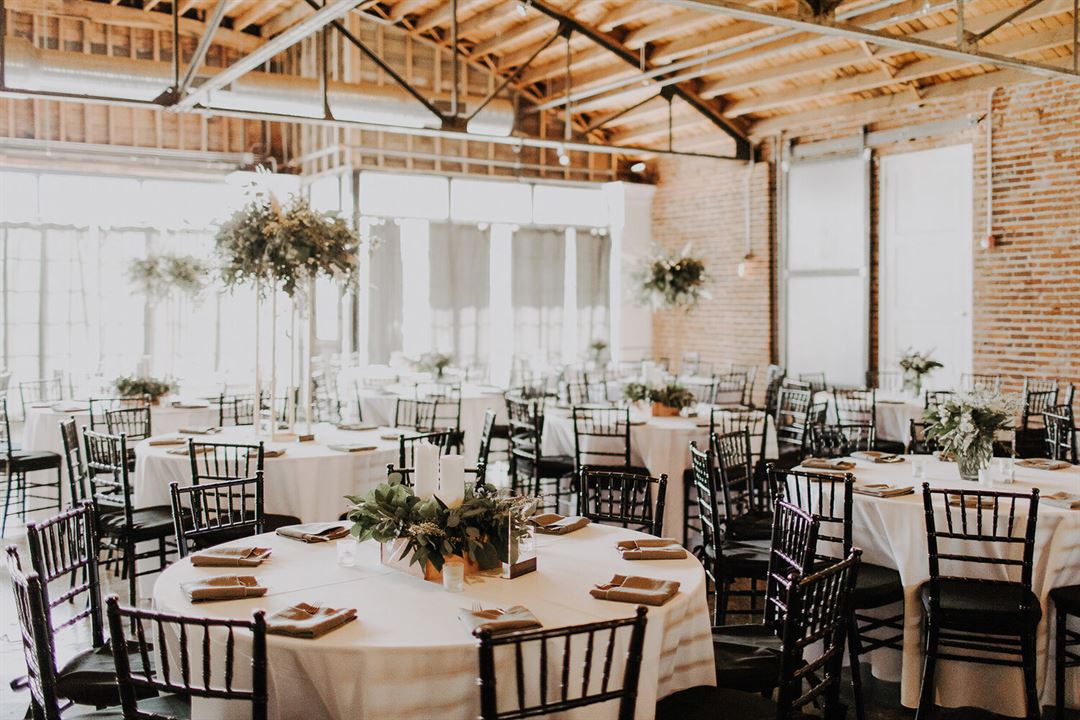 The interior venue radiates a distinct vintage charm with polished original concrete floors leading to exposed brick walls and 12-foot windows. A 20 ft. hangar ceiling sports a stunning salvaged 12-foot chandelier centerpiece in front of a beautiful custom bar. Floor-to-ceiling subway tiles complement our large family-style tables constructed from reclaimed timber to complete the look.
