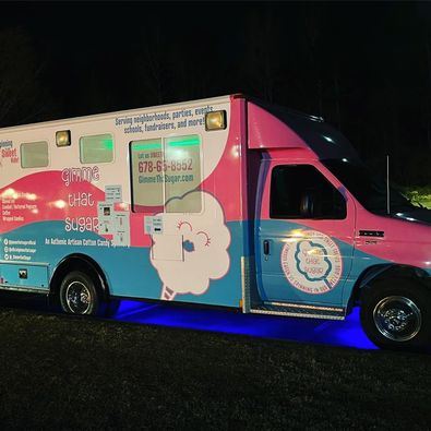 Gimme that Sugar is a gourmet cotton candy food truck! We specialize in cotton candy, but we other items like shaved ice, popcorn with candy toppings, baked treats like brownies, cake pops, and chocolate dipped Twinkies! We hand-spin our cotton candy on a paper cone and serve from our window. Guaranteed to bring smiles on your special day!