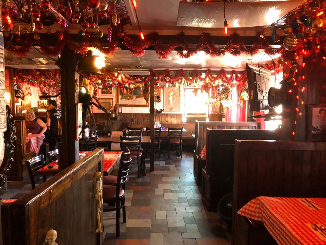 The restaurant decor is an eclectic blend of Christmas, pirate paraphernalia, aquatic murals, handmade boutique-style gifts and old-time movie posters.
