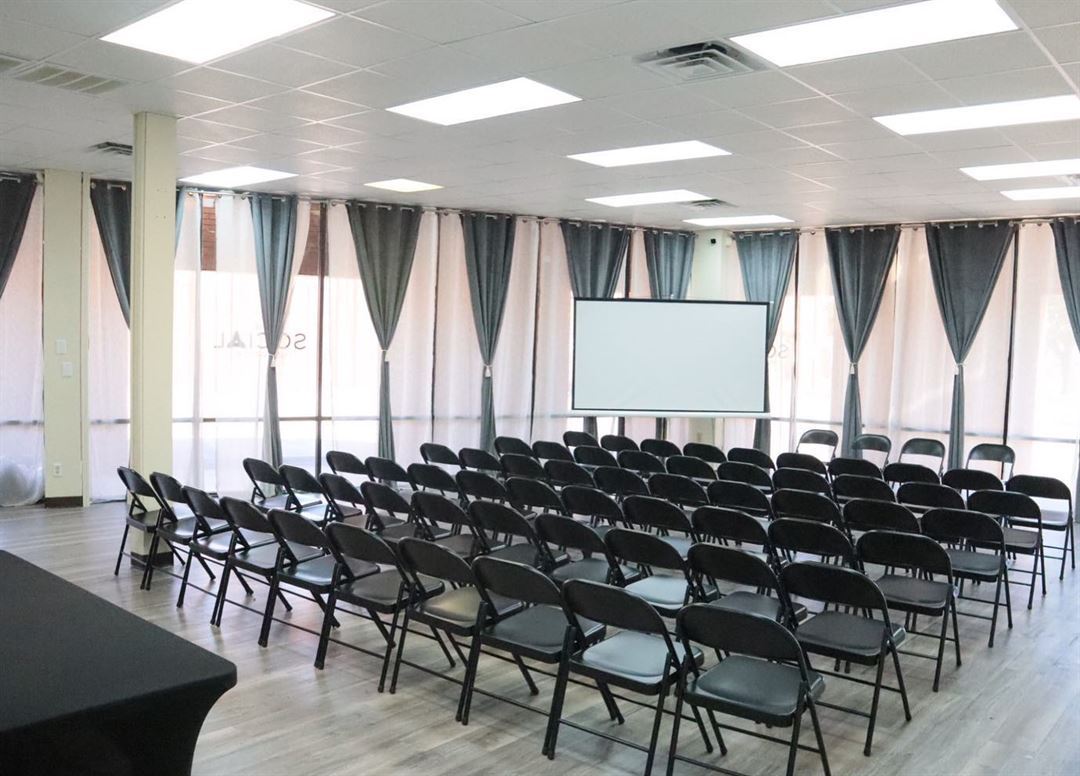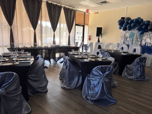 Rental of the space includes use of tables & chairs, table cloths & chair covers, surround sound with microphone, projector & screen, backdrops, kitchenette (refrigerator, prep tables, sink and microwave), and game room (Xbox Series S with Games, Mortal Kombat, Air Hockey Table).
