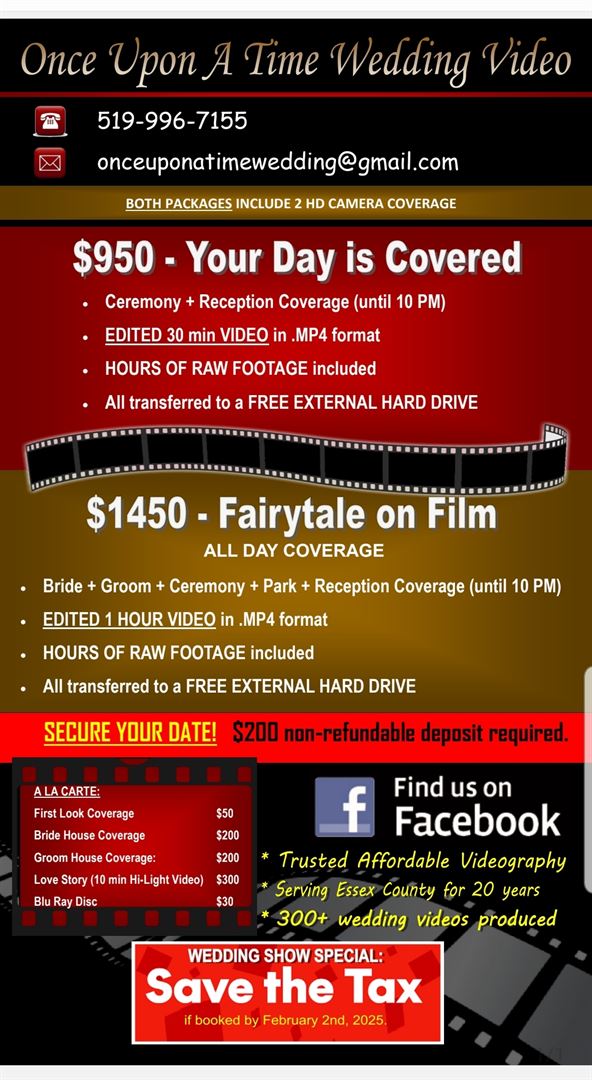 Fairytale packages begin at $950 - so it's easy to see why “Once Upon A Time Wedding Video” has been one of the most trusted videography services around for 20 years. Planning a wedding can be overwhelming, which is why we offer affordable packages tailored to meet your needs without compromising on quality. Our commitment ensures that every heartfelt moment is captured with precision and care. We invite you to discover how we can turn your wedding day into a timeless film that you’ll treasure forever.