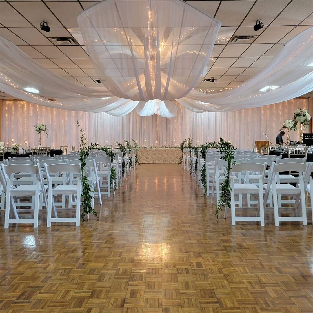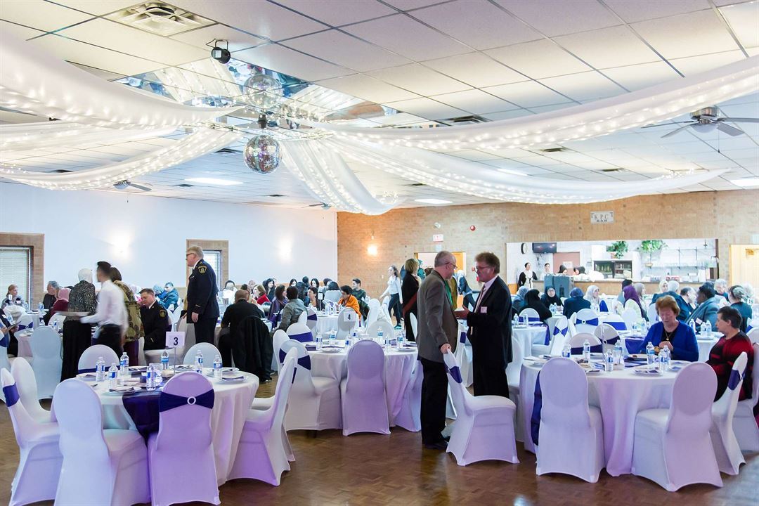 Our main banquet (large) hall has a legal capacity of 376 people, that can be seated at up to spread 40, five-foot round tables you setup, with lots of space still available for a dance area.