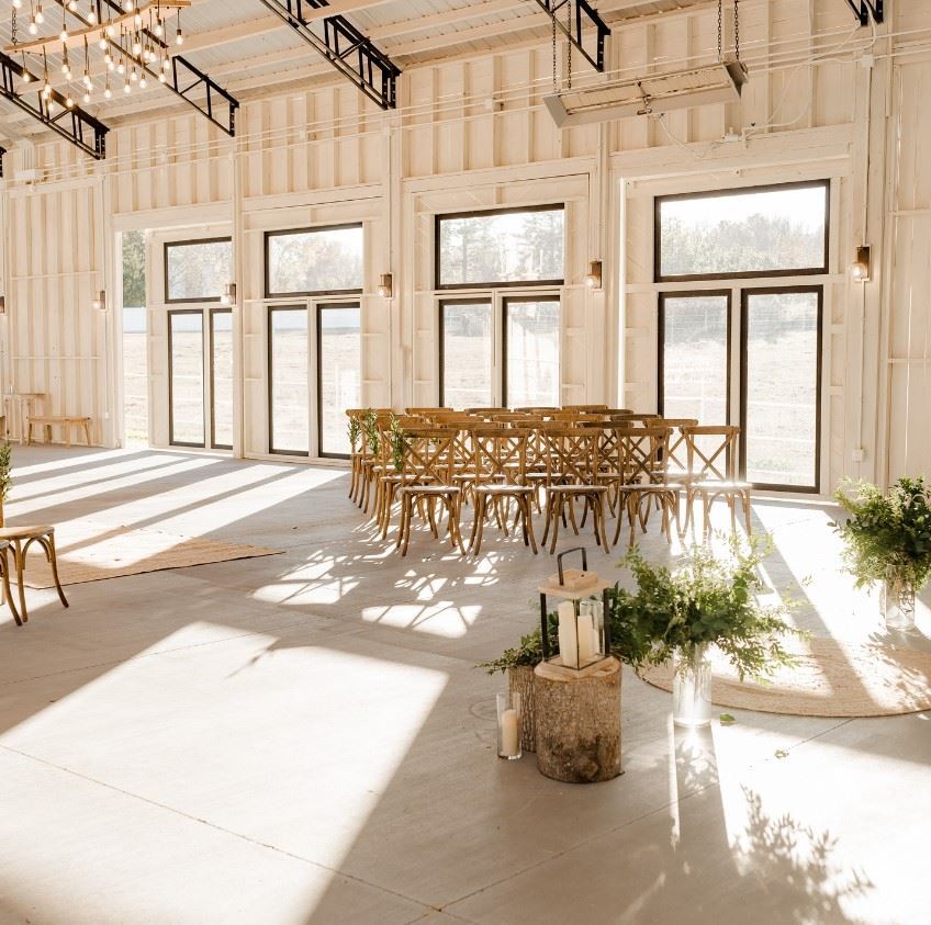 Welcome to a beautiful new North Carolina wedding and events venue. Tucked away from all the hustle and bustle of Raleigh located in Knightdale, NC just outside of Downtown. Our white-washed, modern barn venue is nestled on 40 acres, where garden ceremonies, fun receptions, and social events take place. Our venue is surrounded by meadows and forest and provides a quaint, romantic setting for sharing your special day with those you love.
