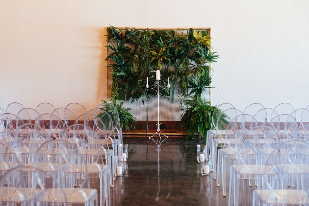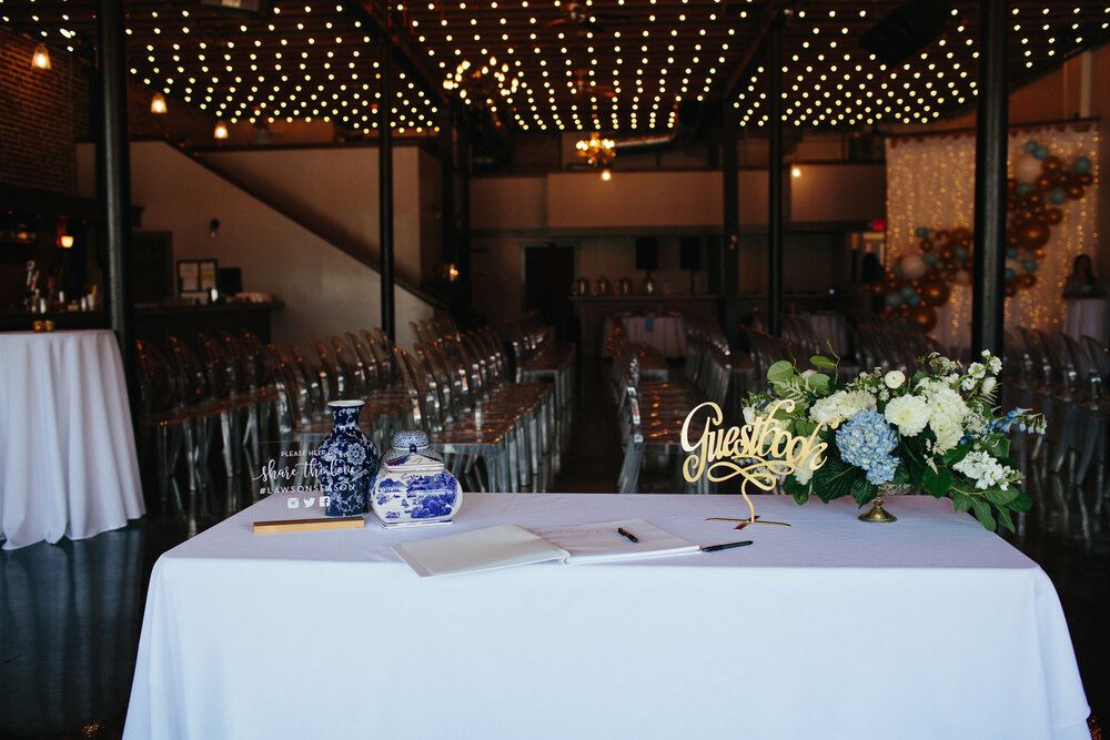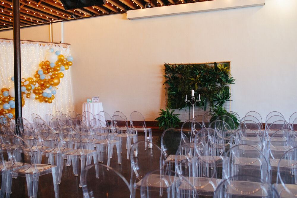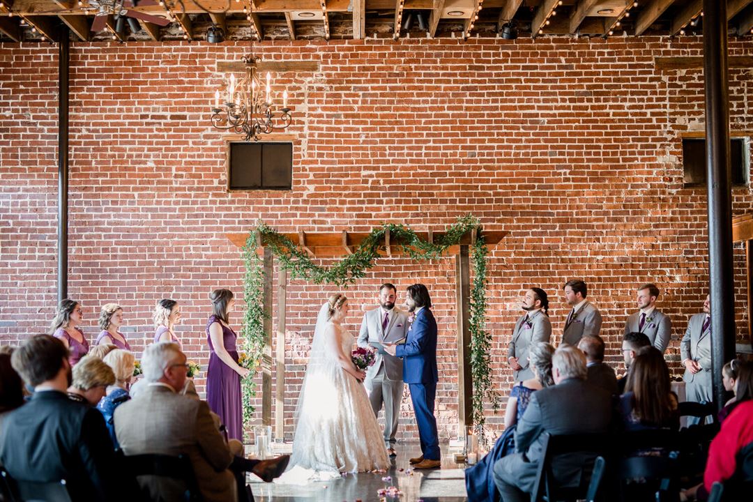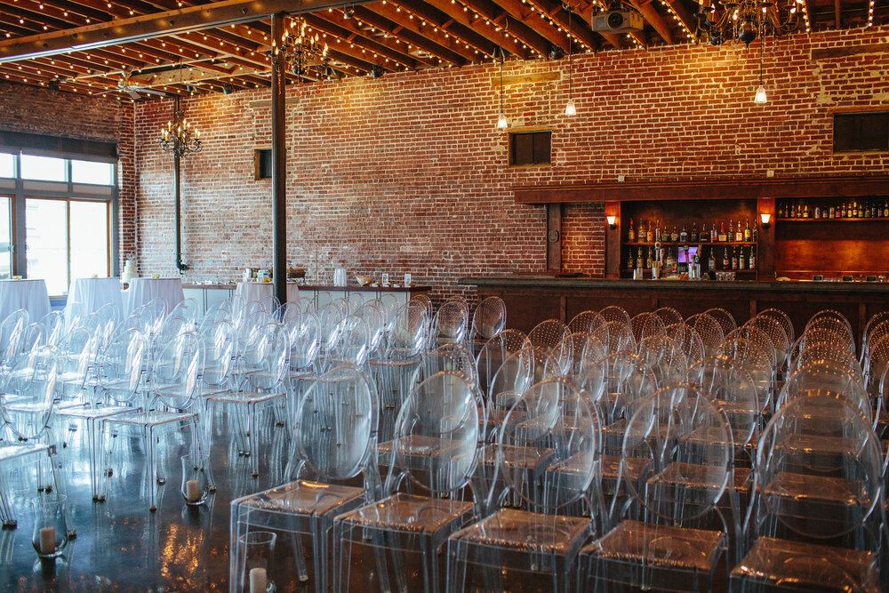 This 5,000 square foot space can host up to 200 people seated at tables and 300 people standing. With original exposed brick, bistro lights strung across 16-foot rough-sawn wood ceilings, large front windows, and light grey walls, this historic wedding venue has both a charming, yet simple atmosphere, so that you can make your event all your own.