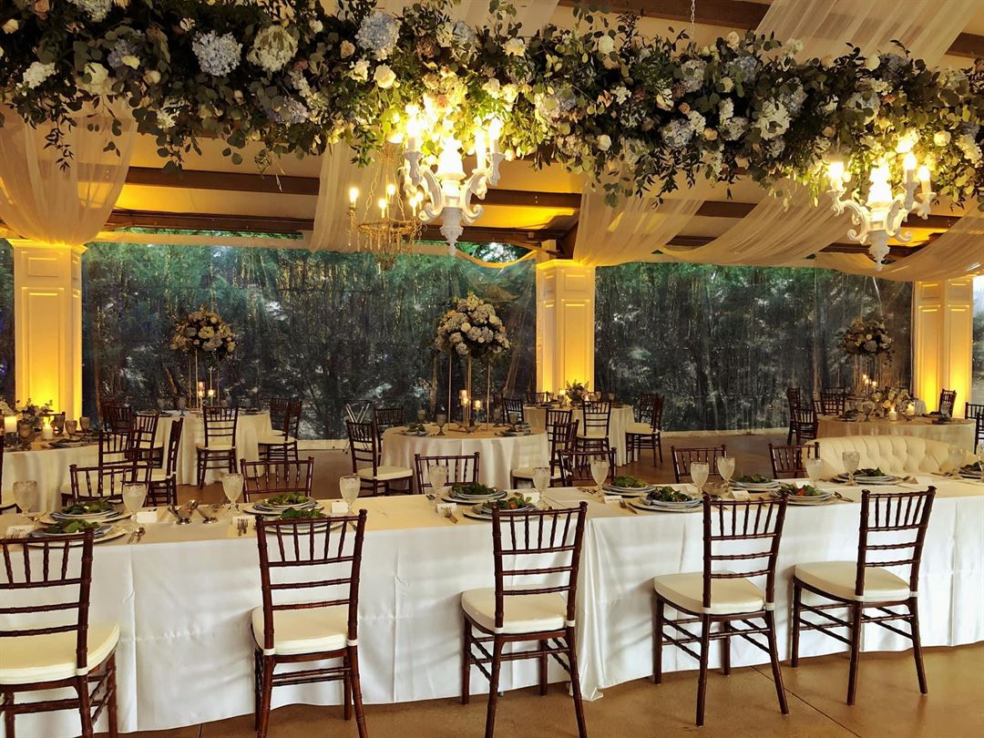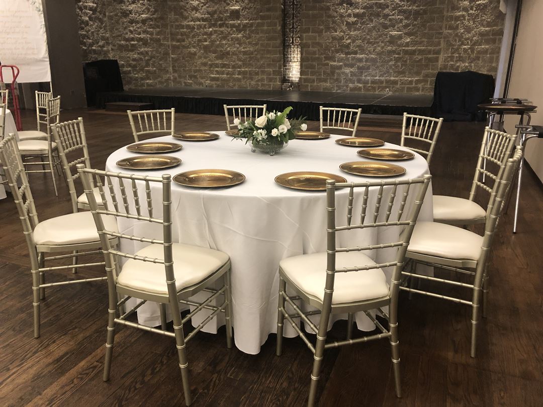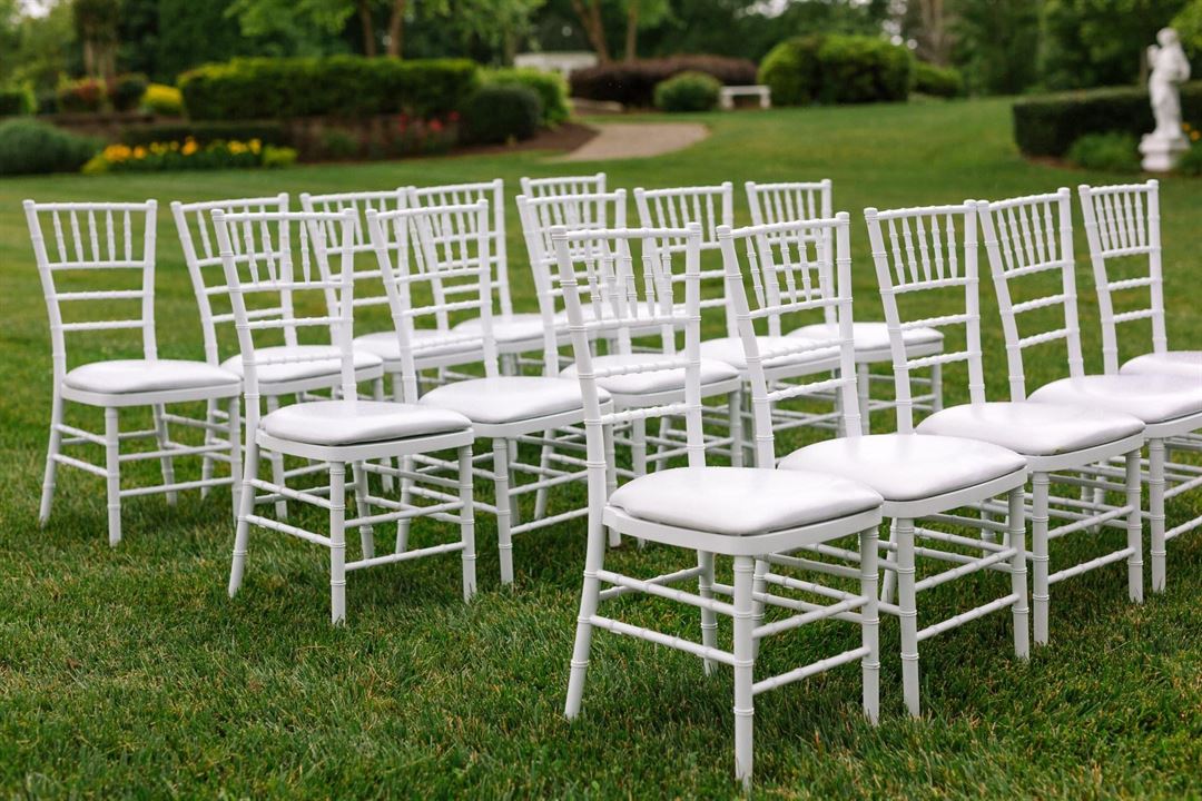 Our chiavari chairs are steel core and hold up to 350 pounds. They include a cushion and come in champagne gold, white and fruitwood. We personally deliver, set up and pick up our chairs. Chair covers come in white, ivory & black with many sash colors.