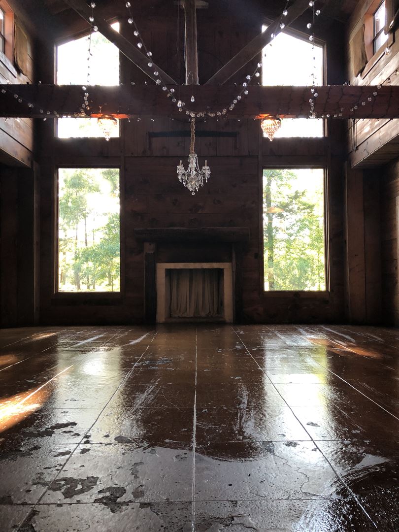 The Barn has floor to ceiling window between a large fireplace with a beautiful chandelier that catches your eye from the moment you enter through the large doors.