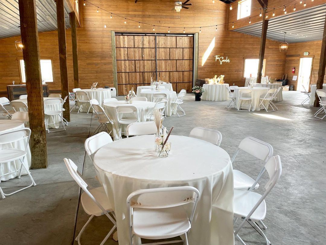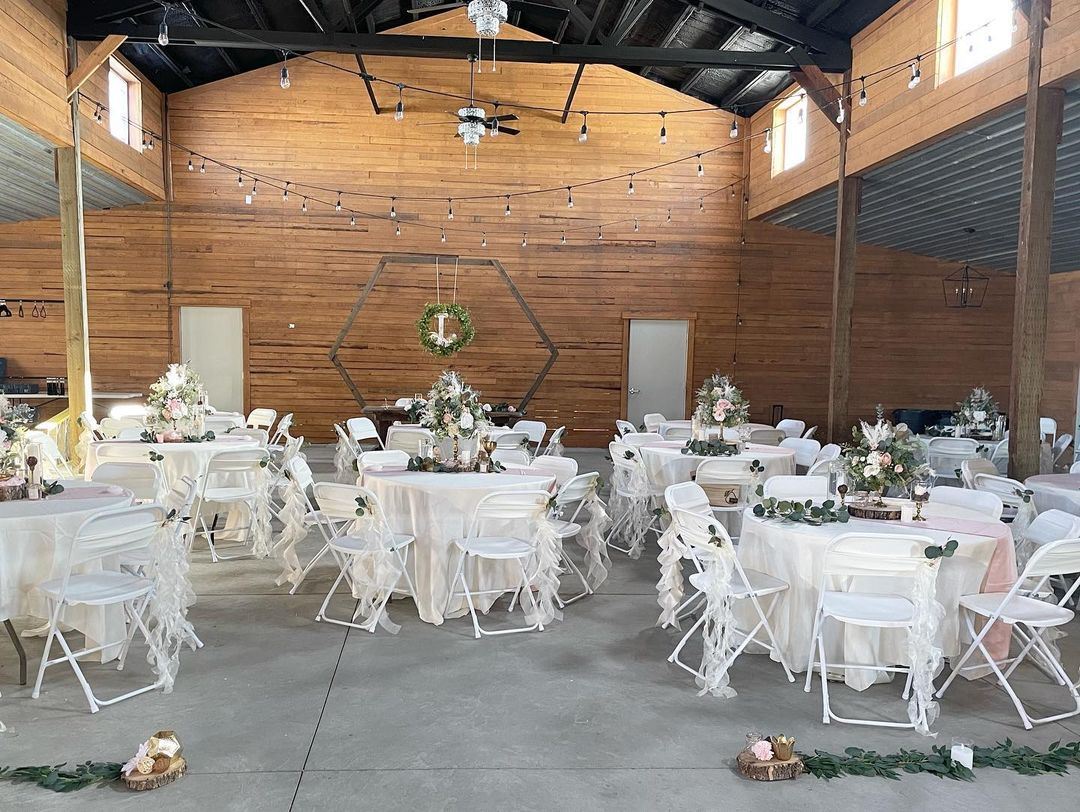 Indoor bridal suite, bathrooms, prep kitchen/groom area, onsite parking, 242 chairs with tables, 4 whiskey barrels, sweetheart table, and other items that are available for use.