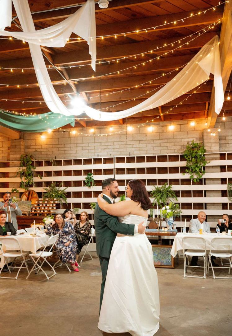 The Bloom Room (Industrial Warehouse) – A lush industrial-chic warehouse with soaring ceilings, rustic wood, exposed brick, hanging greenery, and a custom plant wall. Two oversized roll-up garage doors open the space to the outdoors, while twinkle lights add warmth and ambiance. Includes two individual restrooms and a built-in bar area with mini fridge.