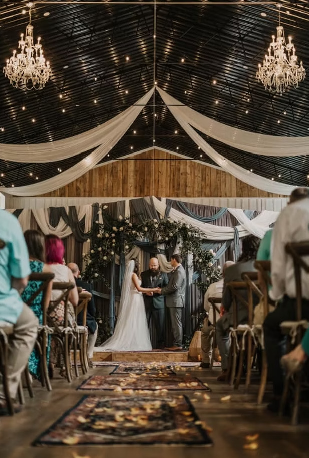 The White Barn at Padgett Place offers a beautiful venue for your wedding, with a charming indoor space and lots of picturesque nature scenes surrounding the barn.