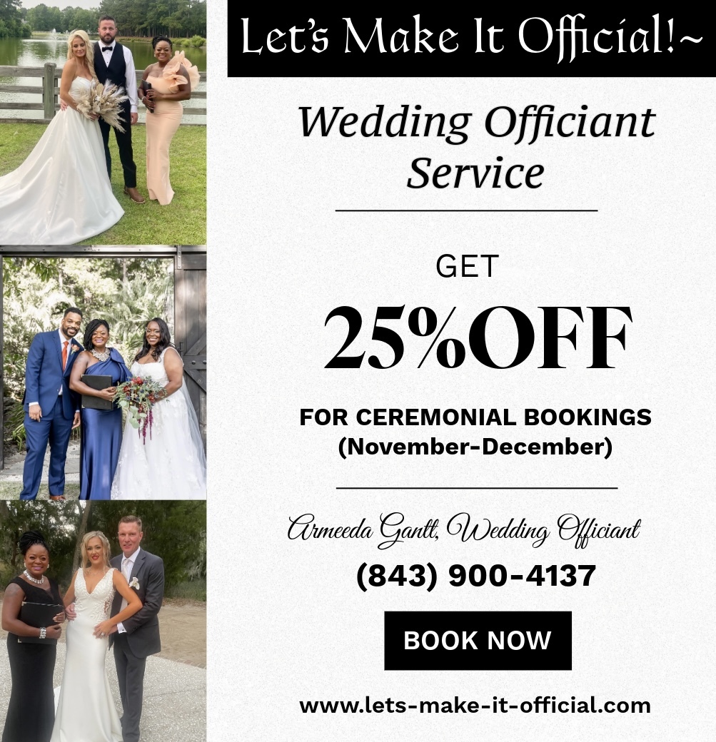 Miss Armeeda is absolutely amazing! She is very pleasant to work with, kind and super accommodating. We had some challenging events to take place prior to our nuptials, but Miss Armeeda was so flexible and ultimately, she officiated and blessed our marriage in a way that made our experience feel intimate and perfect!