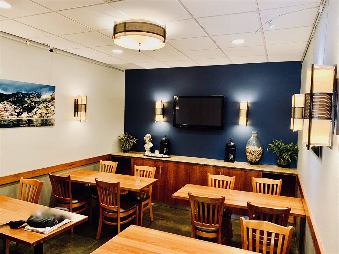 Our private event spaces include two conference rooms, a larger party room, and the option to expand into the wine bar and patio, or even book the entire place! The Community Room offers seating for up to 20 people with flexible table set up, a flatscreen TV, and a privacy door. The Board Room is a beautiful executive style conference room seats up to 14 with a large conference table, flatscreen TV, phone speaker, and privacy doors. Our warm and inviting party room can seat up to 52 people with a fireplace, service bar, bluetooth speaker, and flatscreen TV.