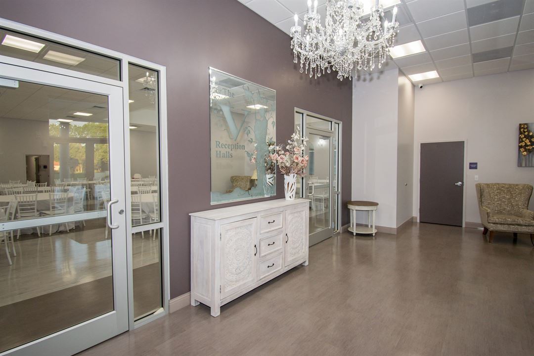 The V Reception Hall is our brand new 12,000 square foot venue located in Lafayette, Louisiana. We offer a beautiful ballroom illuminated by two exquisite crystal chandeliers and two cocktail bars to entertain guests. Adjacent to the ballroom is a 400 square foot meeting room and a covered concrete patio for outdoor events. We can accommodate 299 people at maximum and have a bride’s dressing suite equipped with a private restroom and a full length mirror. In addition, we offer a full commercial kitchen which includes large stainless steel coolers, large gas stove, and more. We would be delighted to help you celebrate your next event, whatever it may be. Contact us for more detailed information, or to schedule a tour!