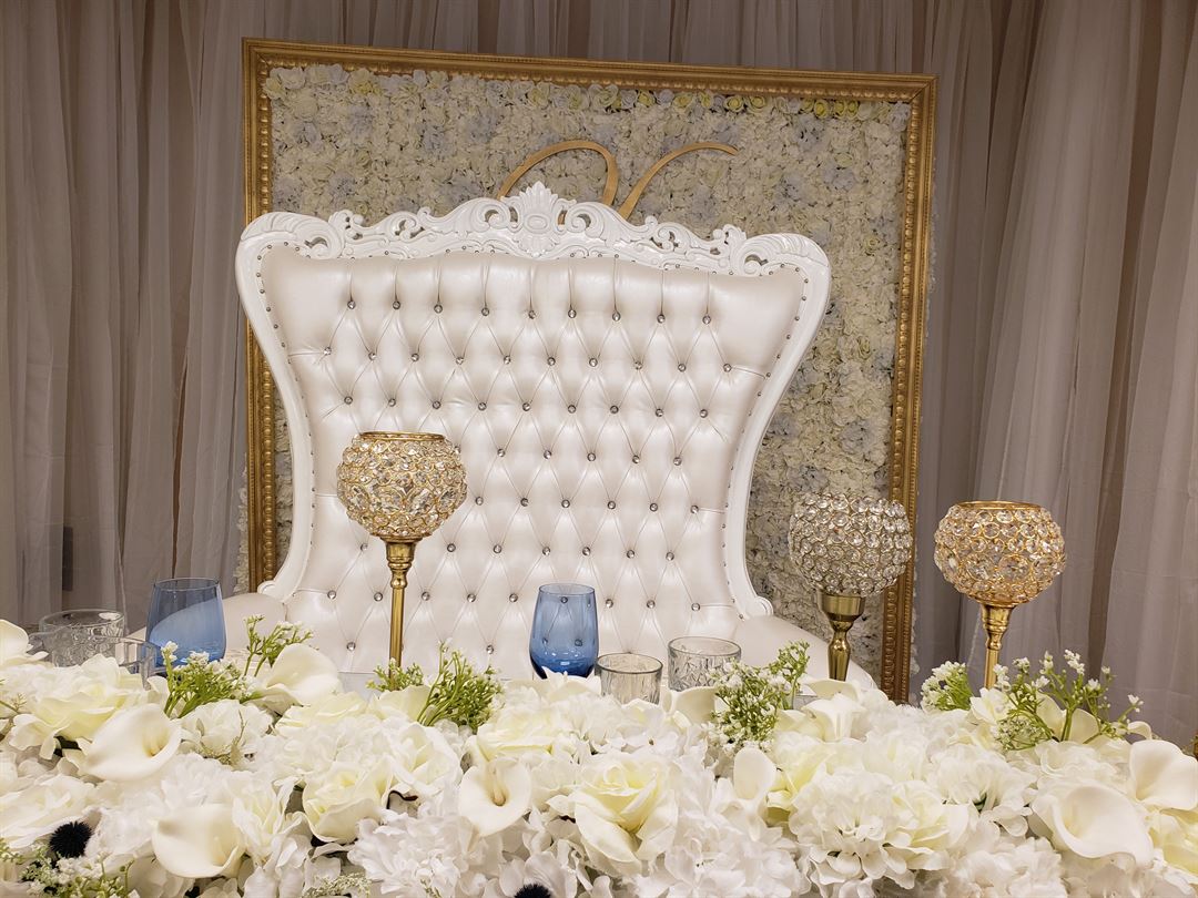 What do we Rent | Gold & Silver Chiavari chairs, White Padded Folding chairs, Royal Throne chairs + loveseat , table linens, charger plates, and pipe & draping
