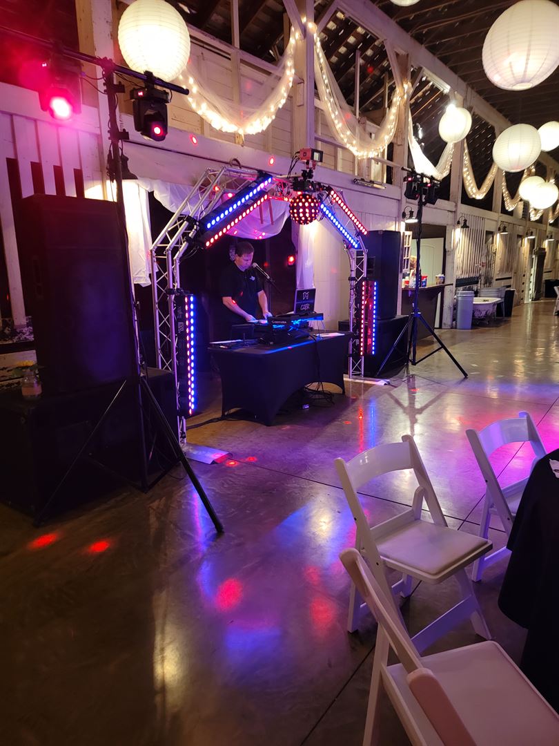 We provide a large professional grade lighting system (consisting of 22 LED concert grade lights, that can be scaled down for smaller venues) that allows us to "spotlight" key moments in your event, such as Bride & Groom/Bridal Party entrance, cake cutting, toast, and first dance.