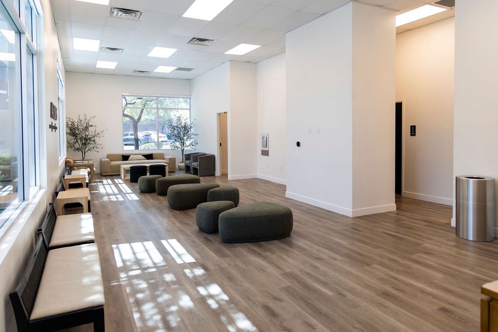 800 sq ft lobby with modern seating and two Elkay purified water dispensers.