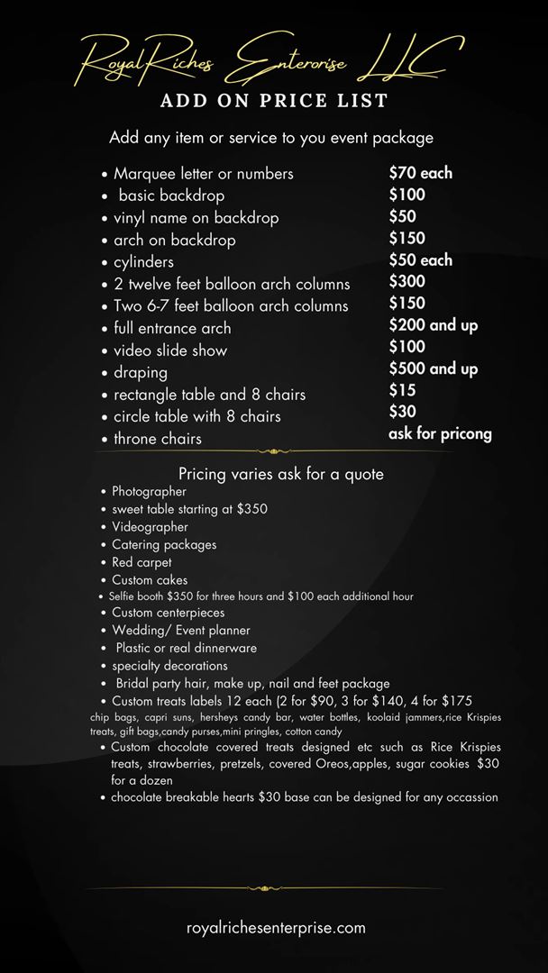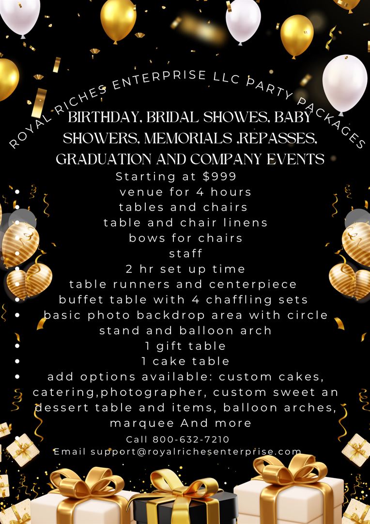 Let me be your fairy god mother planner . I will bring your vision to life taking all of your planning stress away . Over 20 years experience . Weddings and all events small or large . Day of or full coordination . You don’t even have to deal with multiple vendors because we have it all and do it all . We have a full service event planning company . We have a venue , decoration service , catering , photography and videography , sweet table, custom items and more .