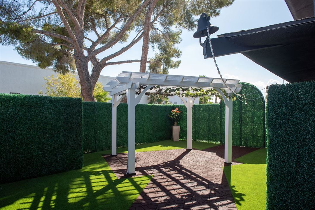 Flower arches for the bride to walk down the aisle. A majestic natural Modello Pine Tree filled and surrounded with wisteria flowers, curly willows, vines, and roses with a sheer white draping backdrop. The room has a built-in state of the art audio, live stream, and video system that will capture every moment of your royal day. This room will be magical, where momentous memories of your wedding day will be created. Accommodates up to 60 guests