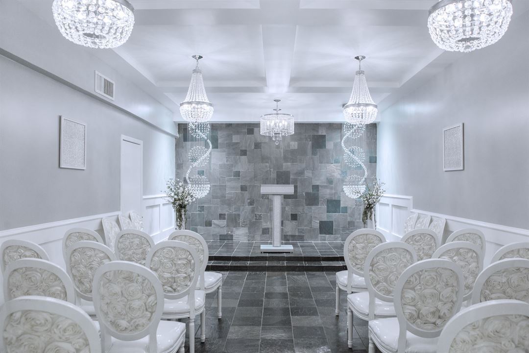 Our Crystal Wedding Chapel accommodates up to 40 guests with a sophisticated modern elegance. This venue is perfect for smaller weddings and renewal of vows. Contemporary chairs, a room filled with crystals creating the perfect atmosphere to say, “I Do”.