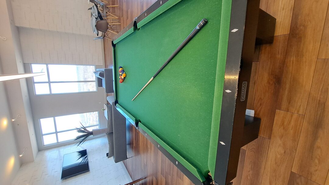 Long sofa - Tables and chairs - Pool Table - Foosball game - 70' TV -Full Modern Kitchen - Kitchen Bar area with stools - Lots of open space too