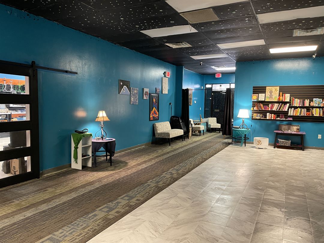 Activities that work well in our space include yoga classes, workshops, meetings, open mics, podcast recording (bring your own equipment), and sister circles. The space is very versatile and can be arranged to fit your needs. This unique space is 1600 square feet and can fit 30 people comfortably. This space has holistic decor, a metaphysical library and it is attached to the Metaphysical store! We are located There are plenty of parking spaces in the shopping center parking lot and there is additional parking in the back of the building.