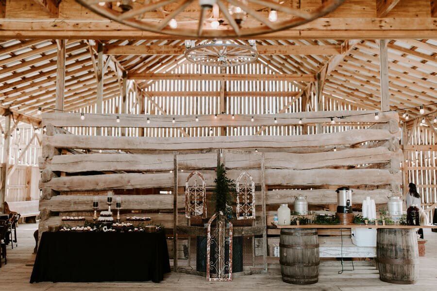 The 4,000-square foot barn has plenty of room for your guests and endless options for floor plan design and décor. It includes a timber log hewn catering kitchen, hardwood floor, restroom facilities and a loft perfect for a DJ, band or photo op. Church pews and whiskey barrels are available for décor items.
