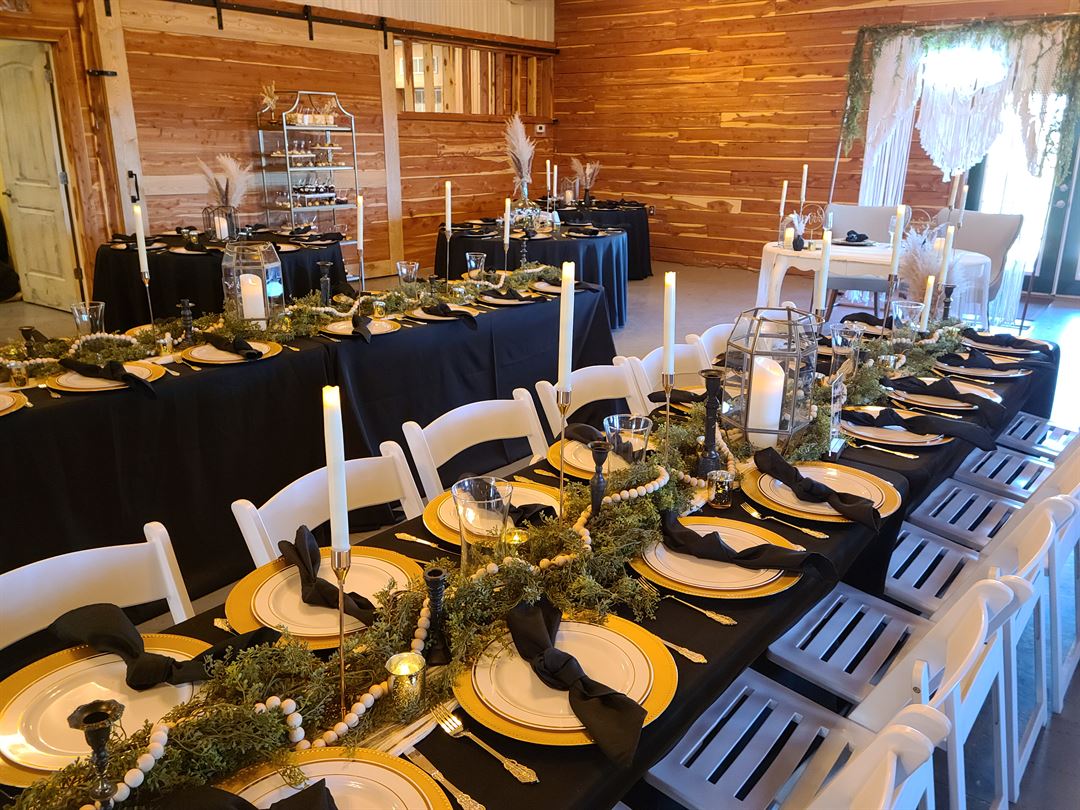 Bridal and grooms dressing rooms, bar, firepit, two porches, indoor and outdoor ceremony facilities, heat and air conditioning, kitchen two restrooms and more. For full details you can look at our website http://twistedcedarfarms.com